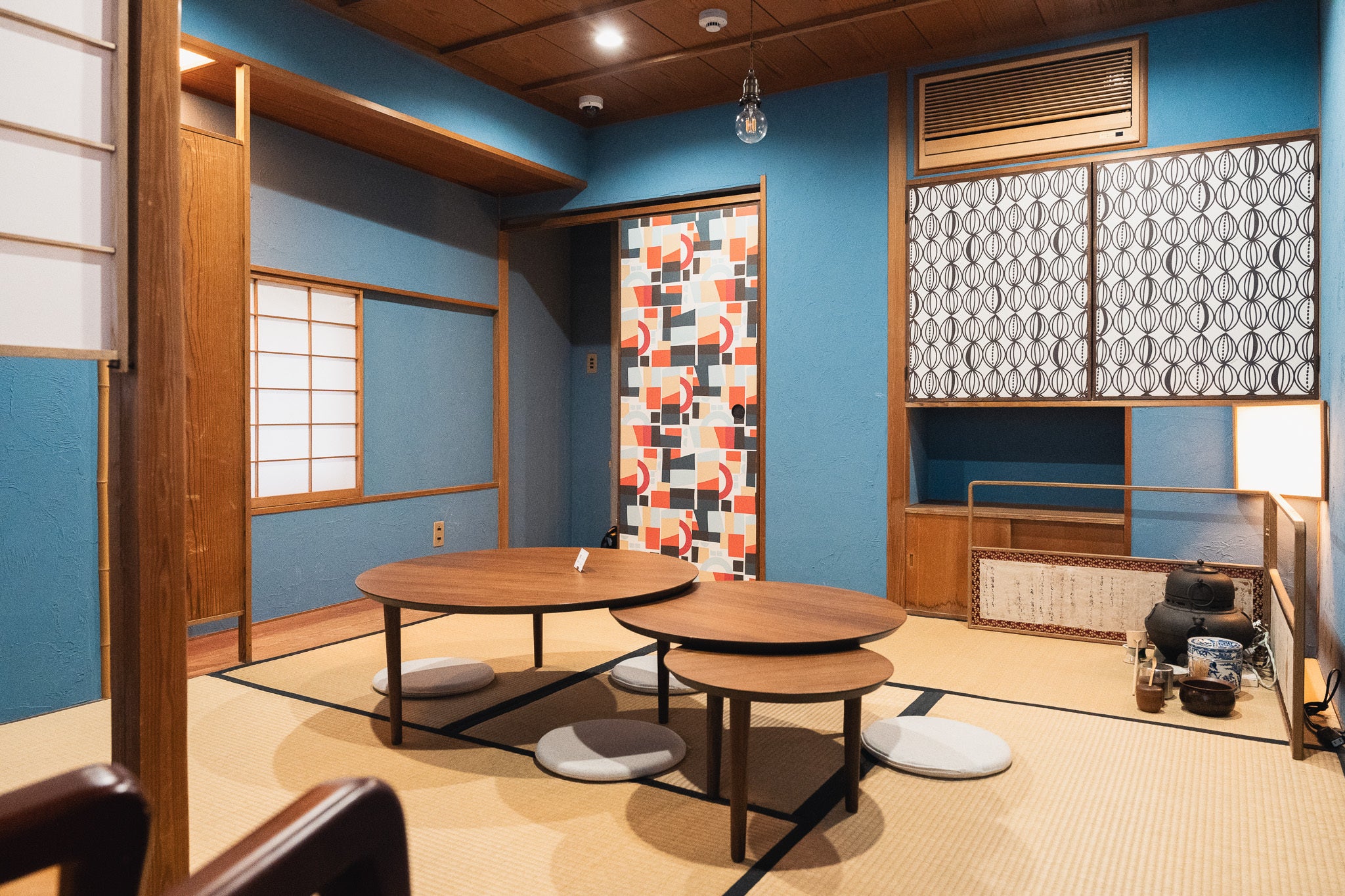 お部屋は京間5.5畳の広間、水屋、床の間から構成されており、6名様までご利用可能です。お茶会、茶道・華道、着付け等のお稽古、女子会、講習会まで様々な用途でご活用いただけます。昼間は自然光が入るので、動画撮影、写真撮影、コスプレ撮影にも最適です。飲食物のお持ち込みも可能ですが、友安製作所カフェで人気のハンバーガー等もテイクアウトでお楽しみいただけます。またお茶会・茶道をご希望の方には、有料にて道具の貸し出しも行っています。