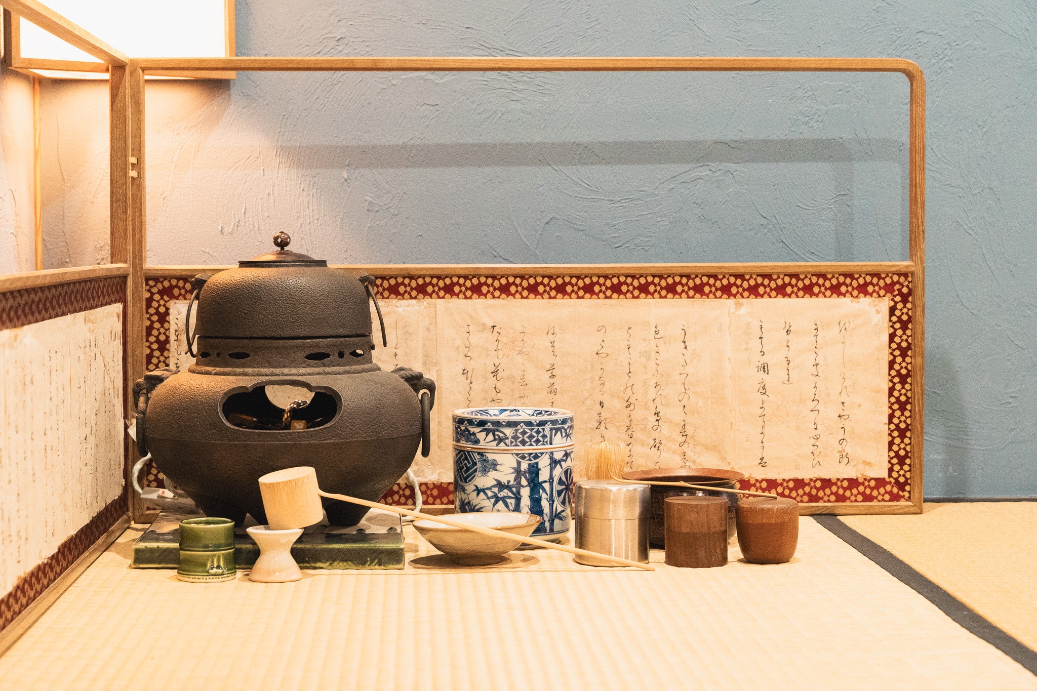 【有料オプション】茶器セット:¥1,100(茶釜、茶杓、柄杓、蓋置、水差し、建水、茶碗、茶筅、棗、抹茶篩)