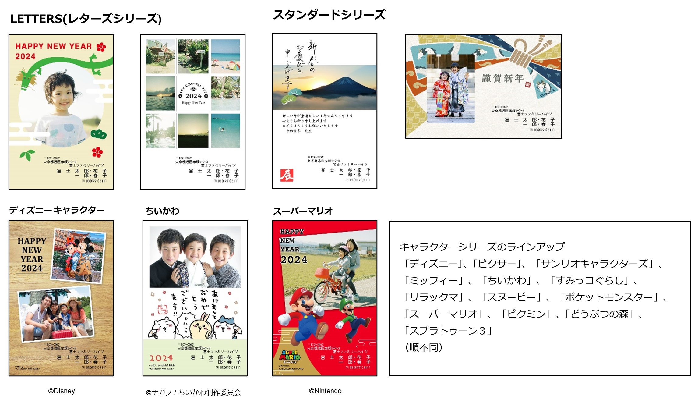 シンプルでおしゃれなデザインの「LETTERS(レターズ)」シリーズ120点、「ディズニー キャラクター」をはじめとした人気キャラクターシリーズ126点、定番デザインのほか、ビジネス用の年賀状にも活用いただけるデザインを集めたスタンダードシリーズ204点をラインアップ。幅広いデザインラインアップから自分好みを選択できます。