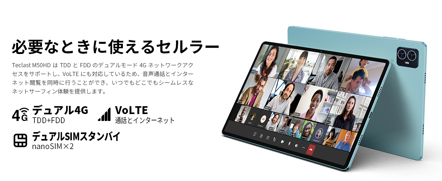 Teclast M50HDはTDDとFDDのデュアルモード4Gネットワークアクセスをサポートし、VoLTEにも対応しているため、音声通話とインターネット閲覧を同時に行うことができます。デュアルバンドac WiFi機能により、より速いスピードと幅広い互換性を誇り、ネットワークの待ち時間を効果的に短縮します。また、ワイヤレスディスプレイ機能もサポートしています。
