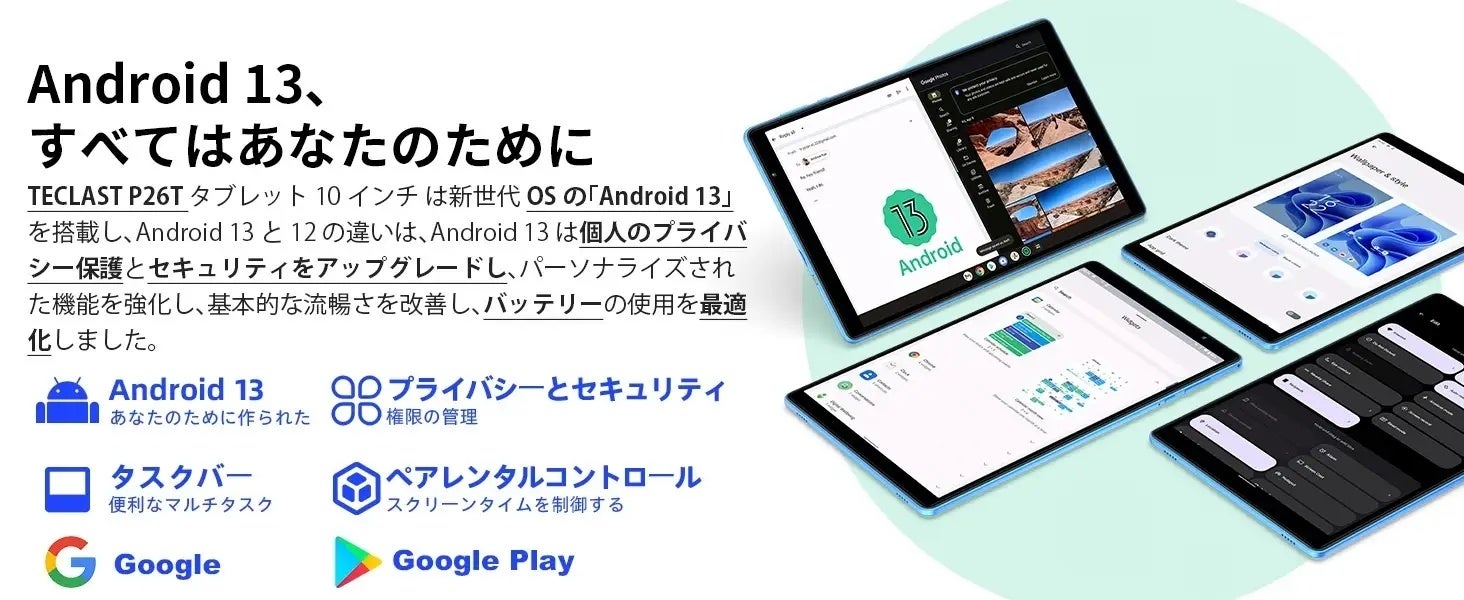 10インチ / Android 13 / 8GB(4+4GB拡張)RAM+128GB ROM+1TB拡張 / WideVine L1対応 / WiFiモデル / デュアルカメラ / 画面分割 / 3.5mmヘッドフォンジャック / 児童守護