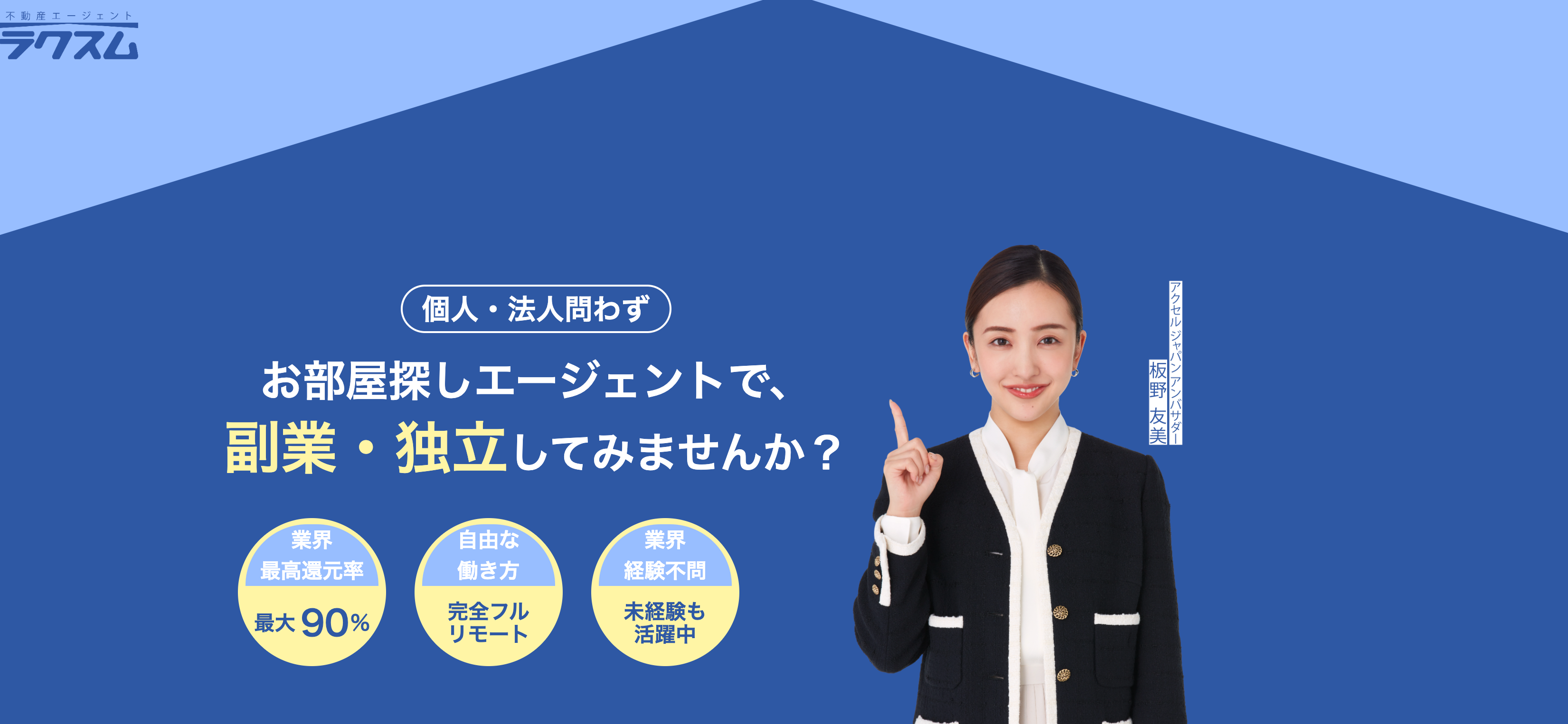 コロナの社会背景があり副業人口の増加が加速している中で、「ラクスム」がノウハウとスキームをパッケージ化し、誰でも明日から始められる副業としてラクスムエージェント【不動産事業の立ち上げ支援サービス】を2023年10月に開始しました。