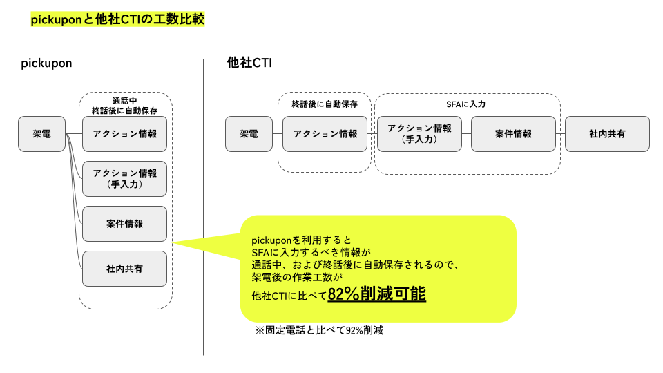 会話サマリーAI電話「pickupon(ピクポン)」は、通話情報をCRM・SFAへ自動入力・シェアするサービスです。また、「HubSpot」はマーケティング、営業、カスタマーサービスのための統合CRMプラットフォームです。この2つのツール連携により、インサイドセールスやカスタマーサクセスが架電後に手入力で行っていたSFAへの情報入力作業を他社CTIによる架電に比べ82%、また固定電話による架電に比べ、92%削減することが可能です。これにより、1日あたり1時間10分、また1カ月あたり5万円の人件費削減につながります。