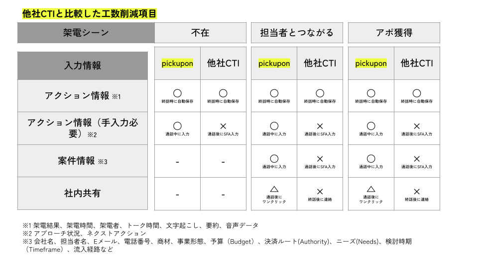 終話後にpickuponのダイアログとHubSpotに自動保存される情報としては、架電時間や架電者、顧客へのアプローチ状況やネクストアクションなどのアクション情報に加え、事業形態やニーズなどの静的な情報も含まれます。