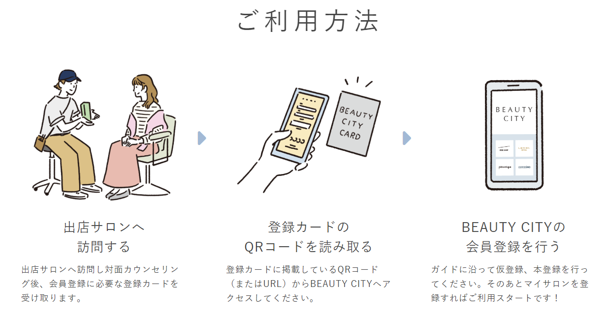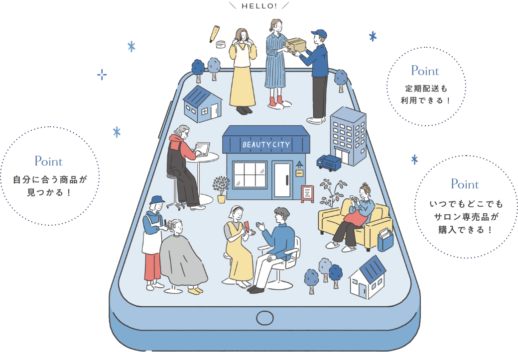 『BEAUTY CITY(ビューティシティ)』は、「“美”を提供するブランドの集合体となりうる場所から、ヒト・社会を輝かせたい」という想いを込め名付けたオンラインプラットフォームです。お客様は、『BEAUTY CITY』に登録しているサロンで対面カウンセリング後、同プラットフォームに会員登録をすると、いつでも欲しいタイミングでサロン専売商品が購入可能となります。