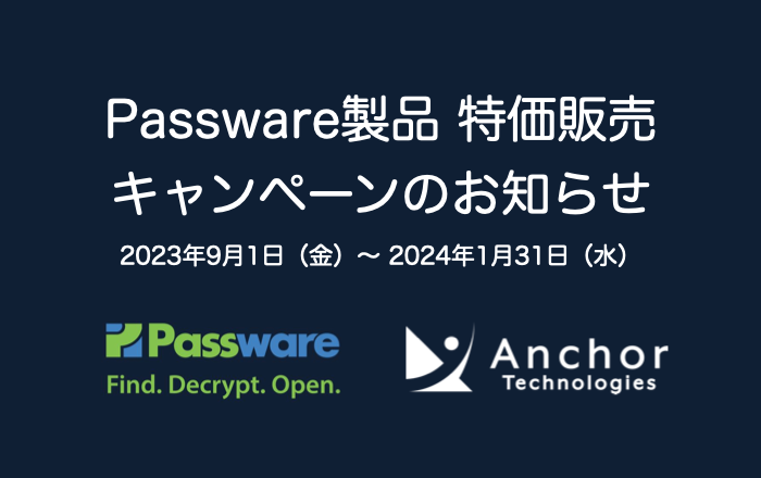 アンカーテクノロジーズ株式会社(本社:東京都千代田区)は、Passware, Inc.(本社:米国カリフォルニア州)の一部製品を、2023年9月1日から2024年1月31日までの間、特価(30%超の割引)で販売いたします。