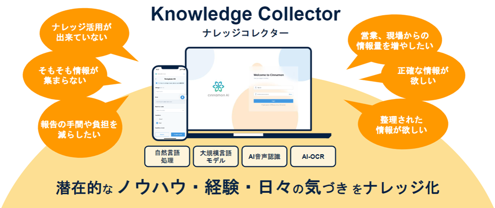 シナモンAIはこれら課題を解決するため、さまざまな手段で簡単に情報入力ができる「Knowledge Collector」を開発しました。「Knowledge Collector」は担当者の入力負担を軽減するとともに、その場で音声入力できることは情報の量・質の向上も期待できます。そのほか、労働集約型産業で多く見られる紙への記録をなくし、ペーパーレス化、デジタイゼーションにもつながります。