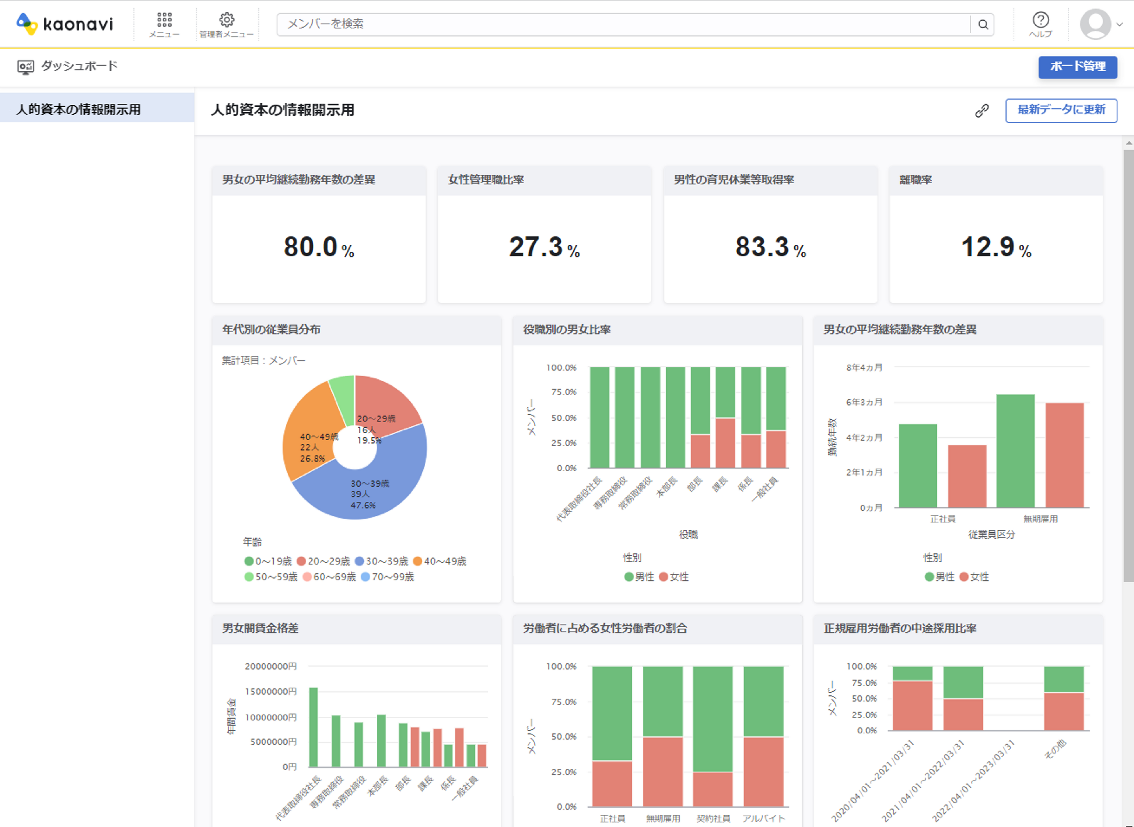 本機能により、男性の育児休暇取得率や女性の管理職比率など、人的資本の情報開示に必要な数値がワンクリックで確認することができます。