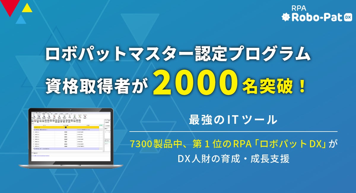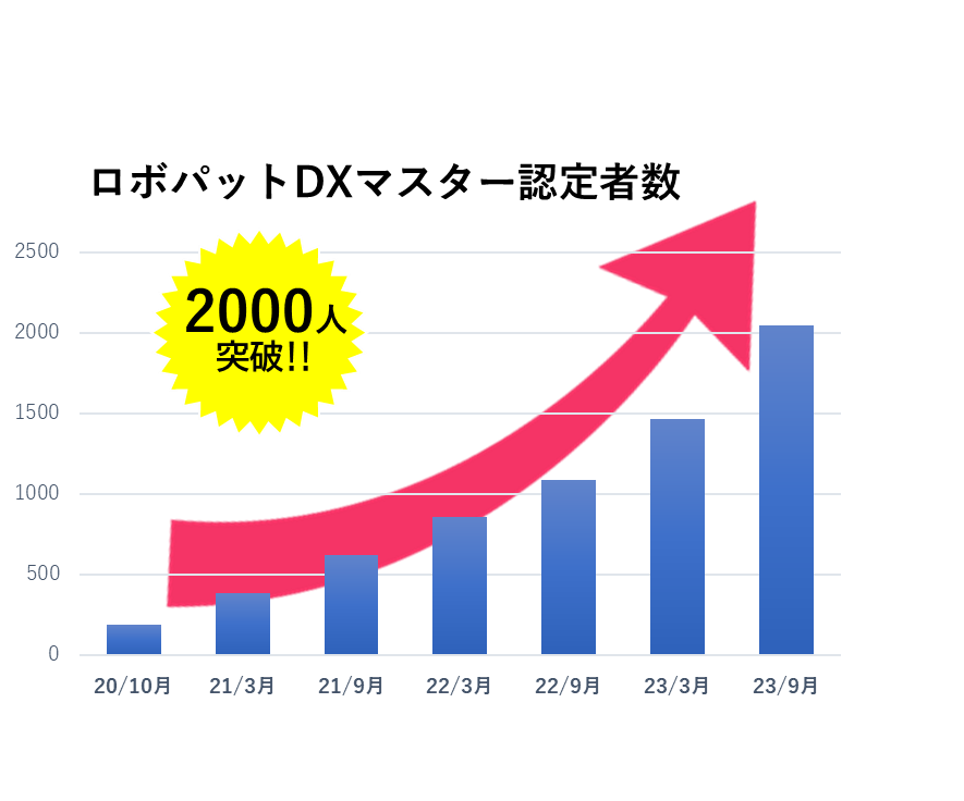 この度、本プログラムを受講完了した「ロボパットマスター認定者」が提供開始から約3年で2000名を突破いたしました。「ロボパットマスター認定者」の皆様には、各企業のDX推進役としてご活躍をいただいています。