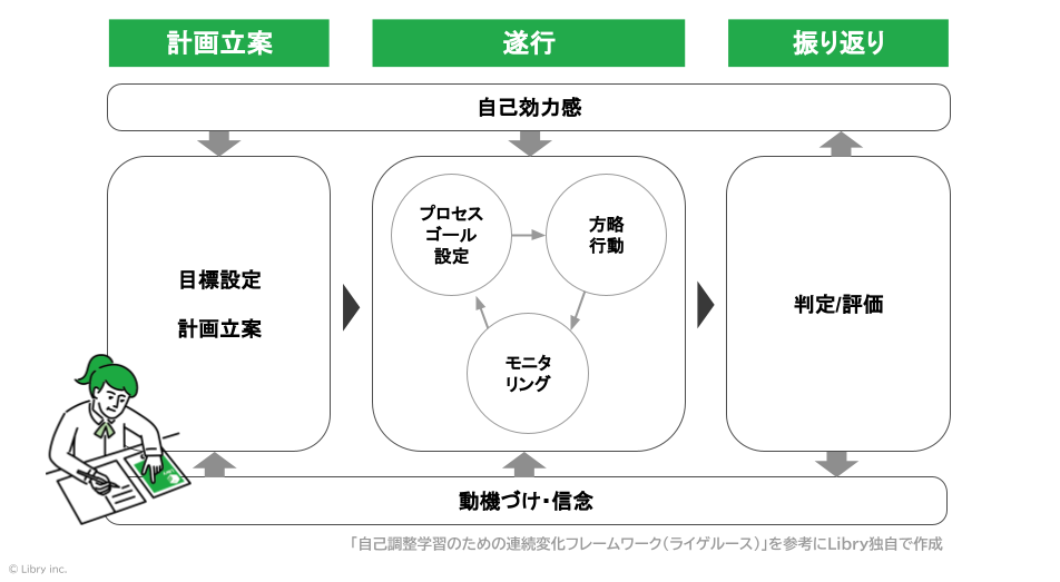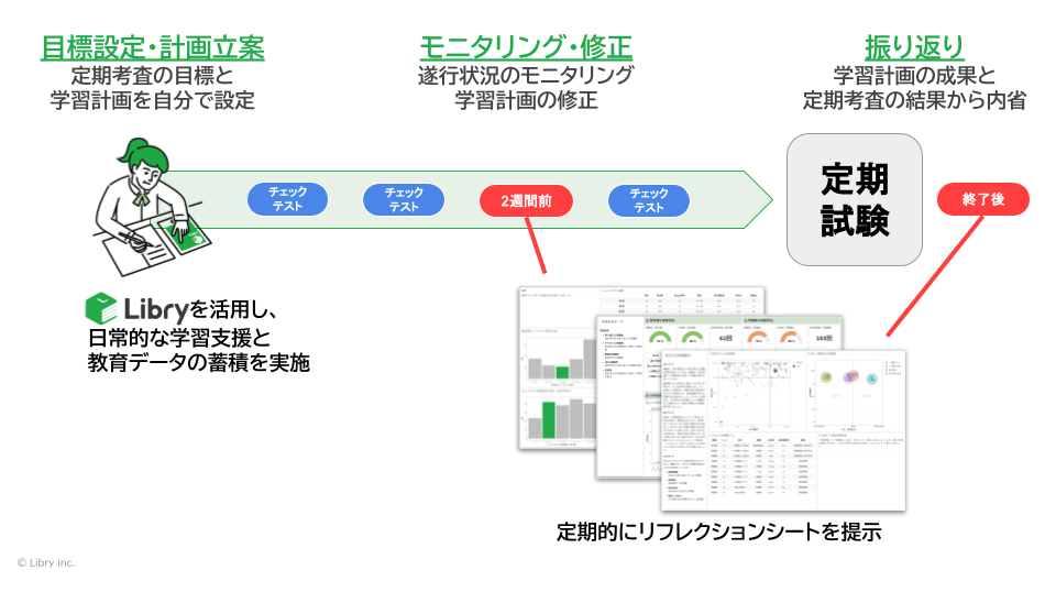 生徒自身で目標を設定し、Libryなどを活用して自由進度で学習を進めます。Libryから得られる日常的な学習記録をもとに作成したリフレクションシートを定期試験2週間前と定期試験後に提示することで学習状況を自覚させ、行動変容を促します。生徒自身が目標設定から実行、計画の修正、振り返りまでを繰り返し行うことで、自己調整学習能力を醸成します。