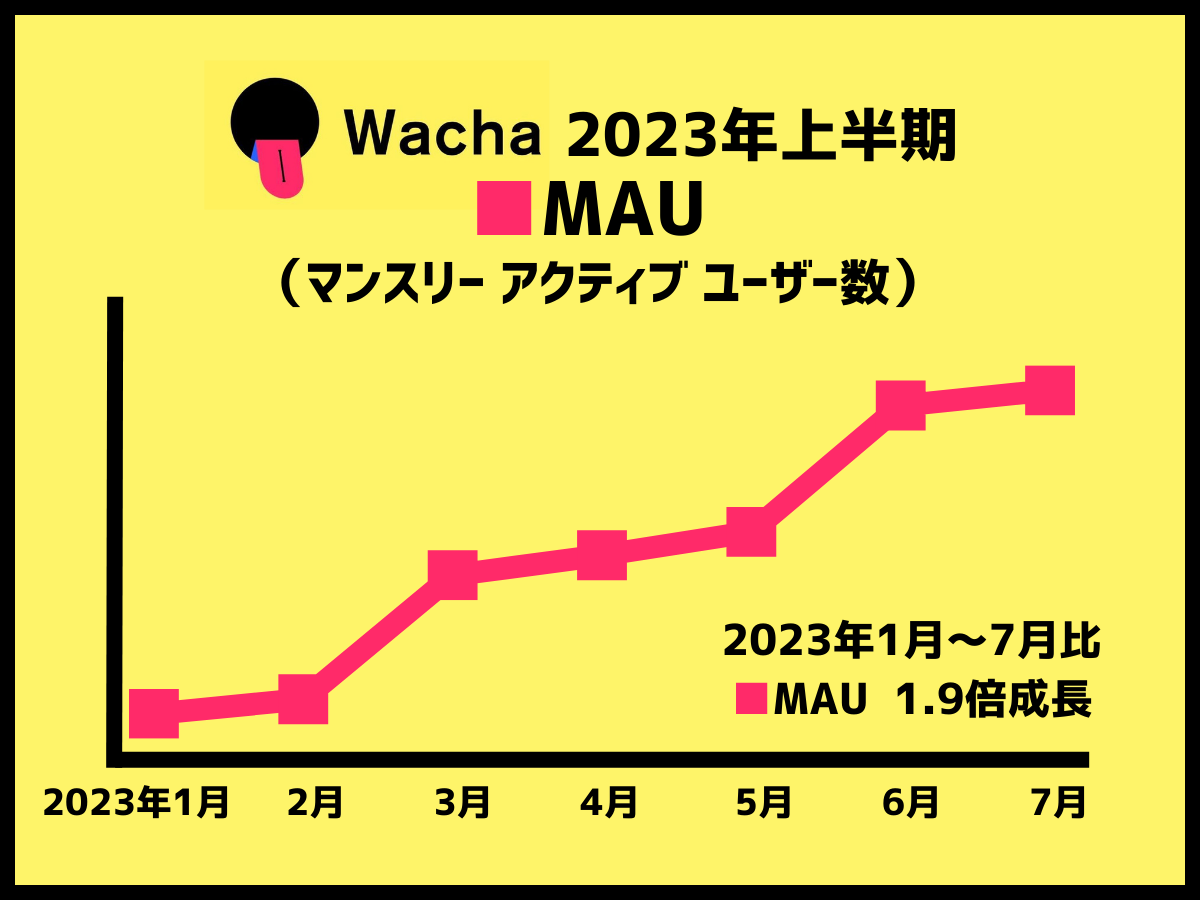 WachaアプリのMAU(マンスリーアクティブユーザー数)は、2022年10月以降の「貢献報酬」システム導入後、2023年1月から7月の7ヶ月間で1.9倍成長しました。これは、アプリを月間アクティブに利用するユーザー数が前年と比較して1.9倍に増加したことを示し、Wachaコミュニティの活性化とアクティビティの増加を反映しています。