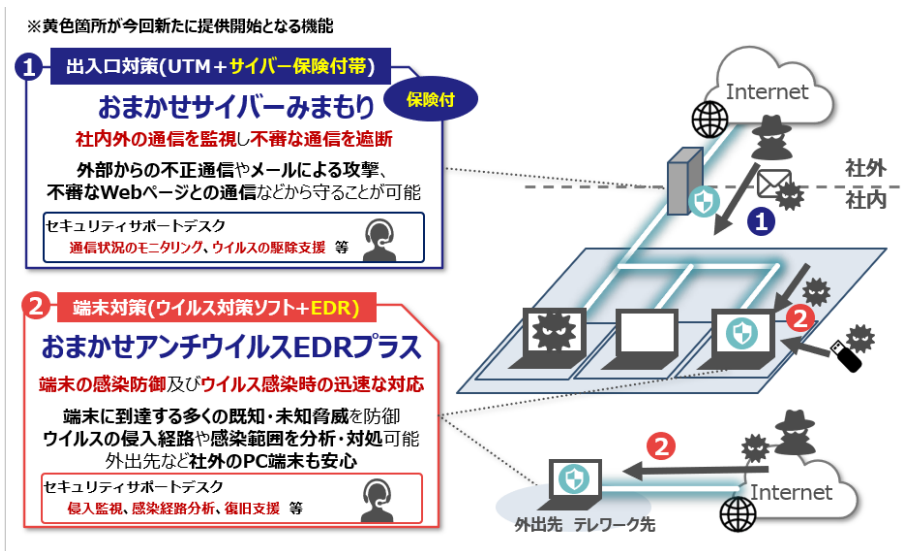 ■また、同日より、法人向けクラウド型ウイルス対策サービス「おまかせアンチウイルス」へ、マルウェア侵入後の「早期発見」「感染拡大防止」「復旧支援」を実現するEDR※2機能とこれらを一元的にサポートデスクにてフォローする機能を具備した「おまかせアンチウイルスEDRプラス」を提供いたします。