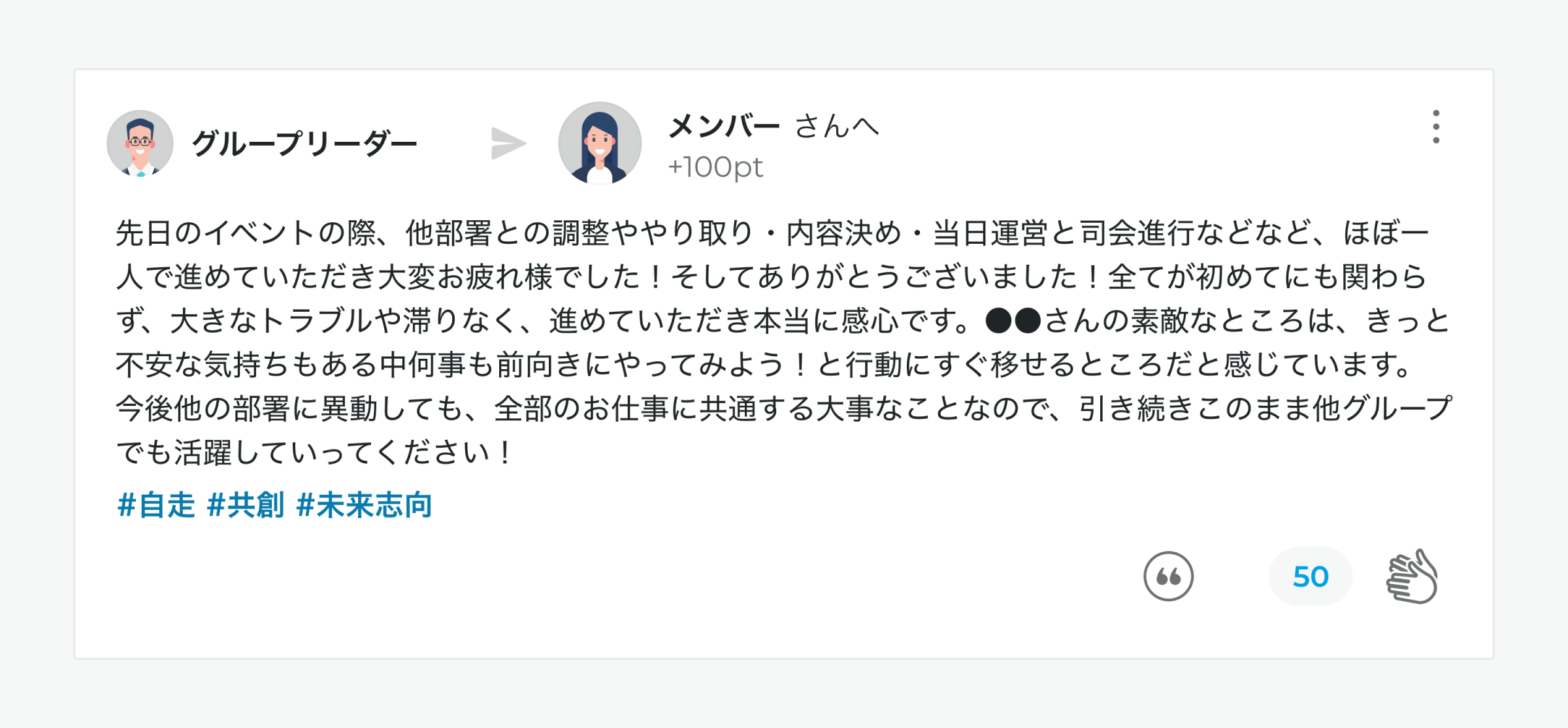 「貢献に対する称賛×少額のインセンティブ」を送り合うことで称賛文化を醸成し、組織を変える行動を増やします。心理的安全性やエンゲージメントの向上、離職率改善など「強い組織」づくりをサポートします。