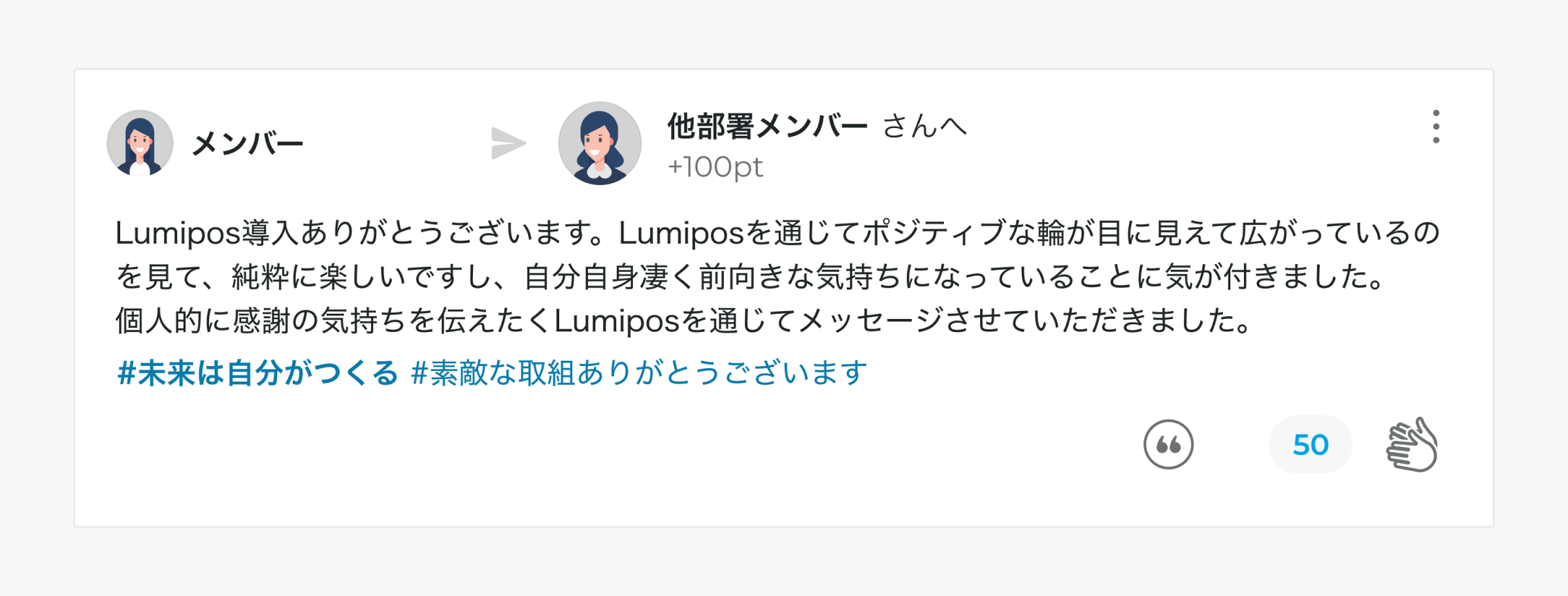ルミネは「the Life Value Presenter お客さまの思いの先をよみ、期待の先をみたす。」という理念のもと、「わたしらしくをあたらしく」というコーポレートメッセージを掲げています。この「ルミネ理念」の実現に向け、まずは社内から「感謝・称賛を贈り合い高め合う文化」をつくることが重要であると考え、「Unipos」が採用されました。会社全体の取り組みとして浸透を加速させるため、本制度をLUMINEとUniposを掛け合わせたオリジナル名称「Lumipos(ルミポス)」としました。