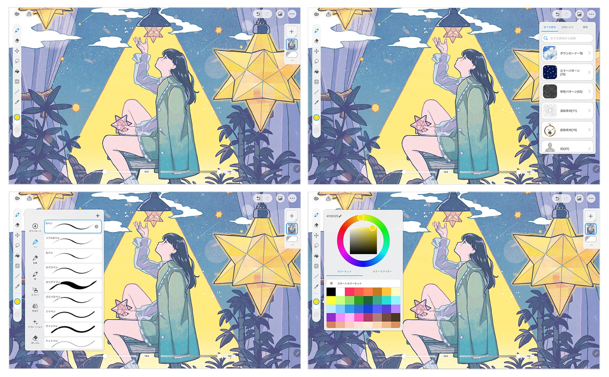 「Galaxy Tab S9 FE」および「Galaxy Tab S9 FE+ 5G」では「CLIP STUDIO PAINT for Galaxy」(*2)を6ヶ月間無料(初回限定)で利用できます。「CLIP STUDIO PAINT」のタブレット向けの、より直観的なユーザインタフェース「シンプルモード」と、「Galaxy Tab S9 FE」シリーズに同梱されているIP68準拠のSペンを使って、エントリーユーザーでもすぐにクリエイティブな作業を始めることができます。
