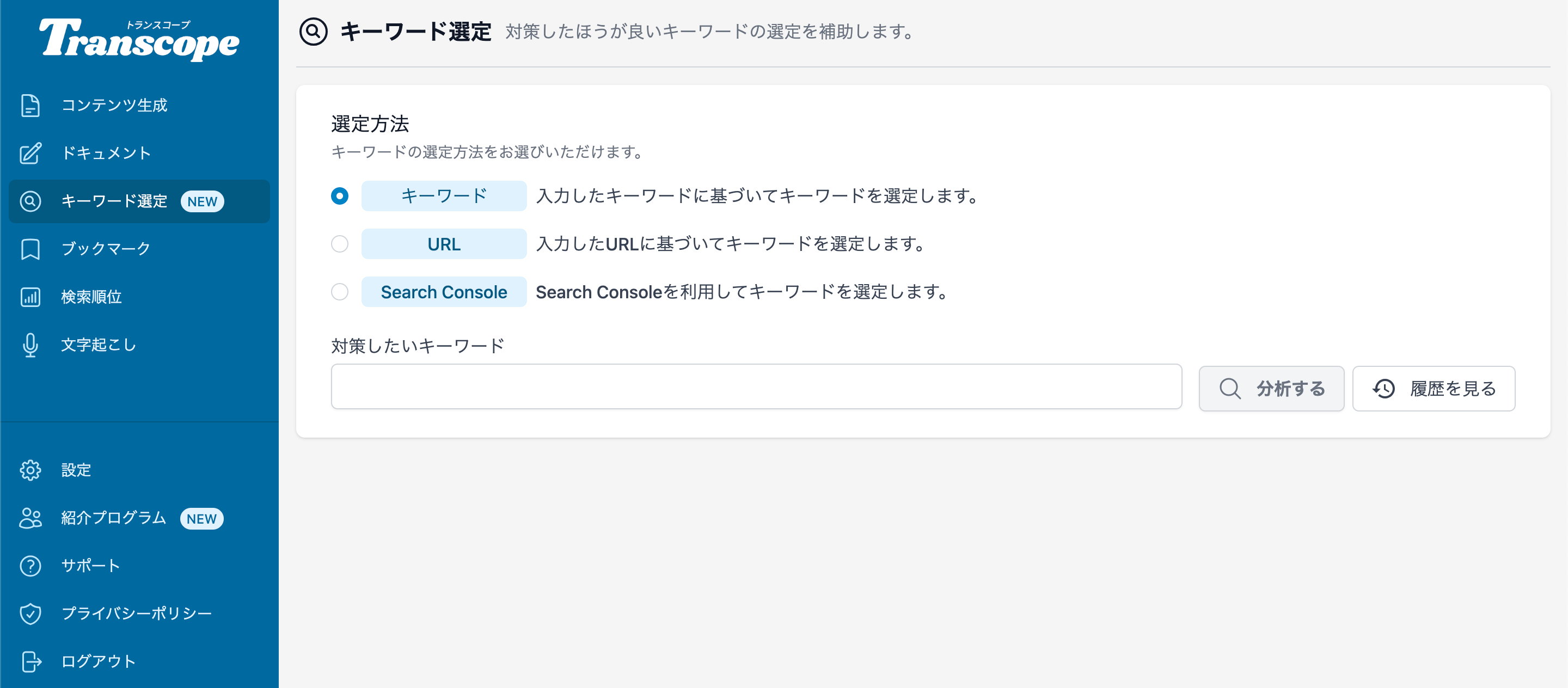 トランスコープの[キーワード選定]メニューをクリックしてキーワード選定画面にアクセスしてください。