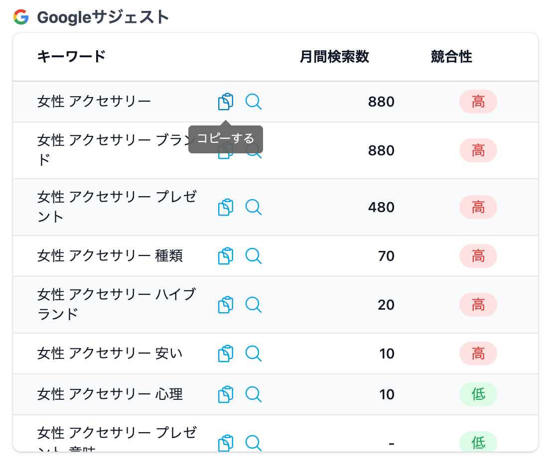[コピーする]ボタンでキーワードをコピーしたり、[Google検索する]ボタンをクリックすると実際にGoogleでの検索結果を確認することができます。