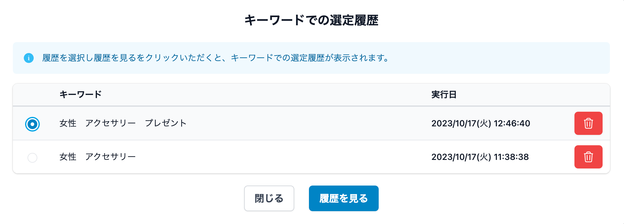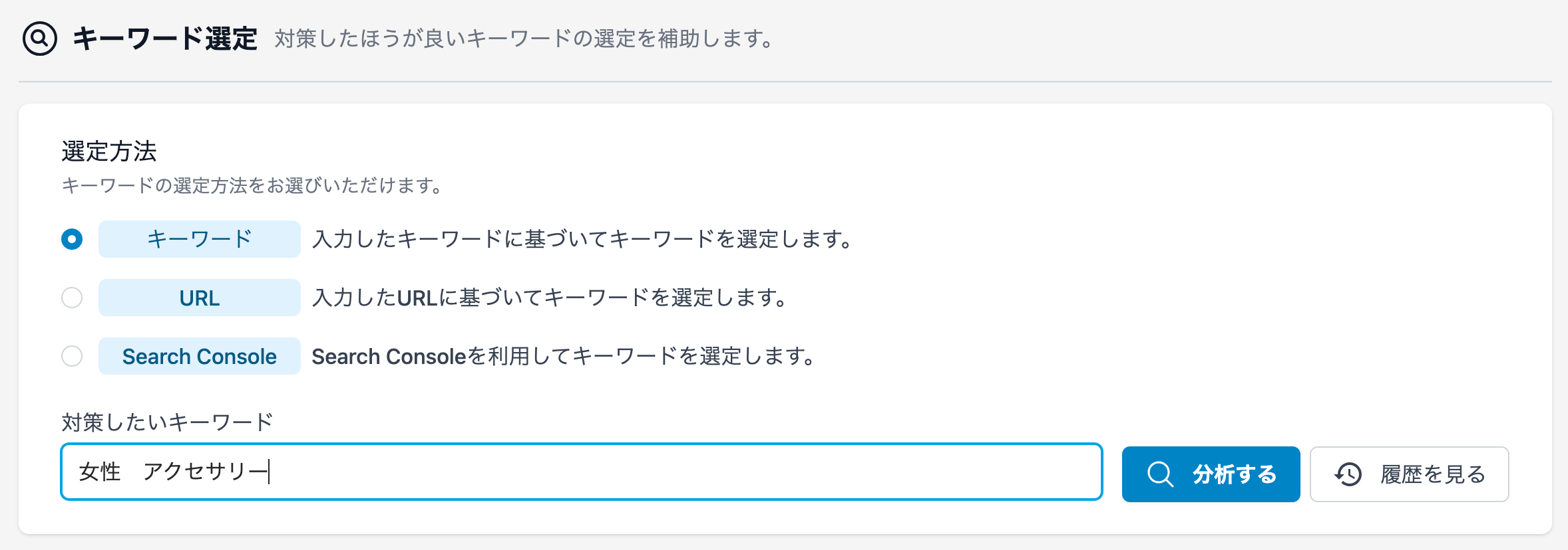 また、[履歴を見る]ボタンから、キーワード選定の結果の履歴をすぐに表示することも可能です。