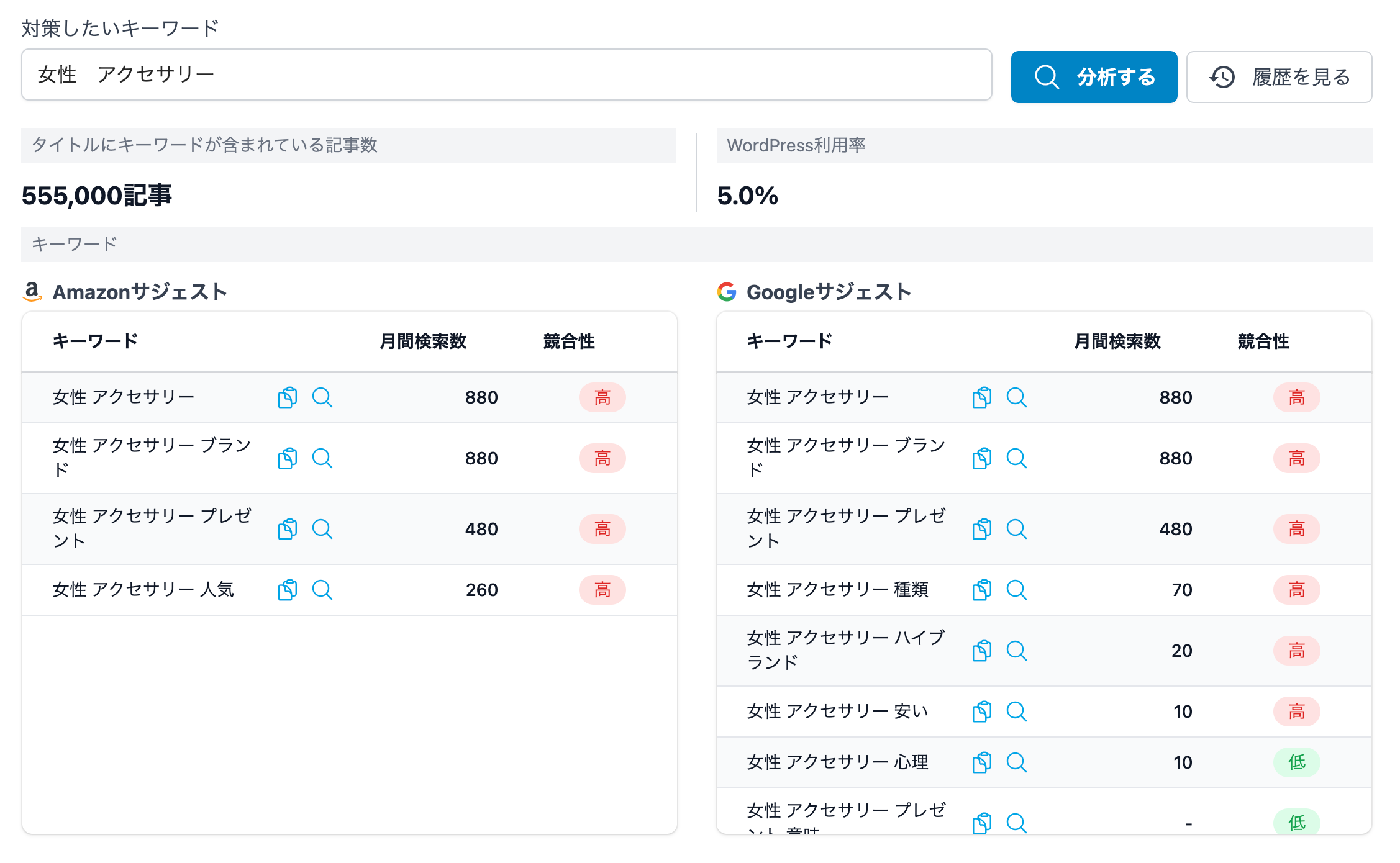 [分析する]ボタンをクリックすると、AmazonサジェストやGoogleサジェストなどでの、月間検索数や競合性の一覧が表示されます。