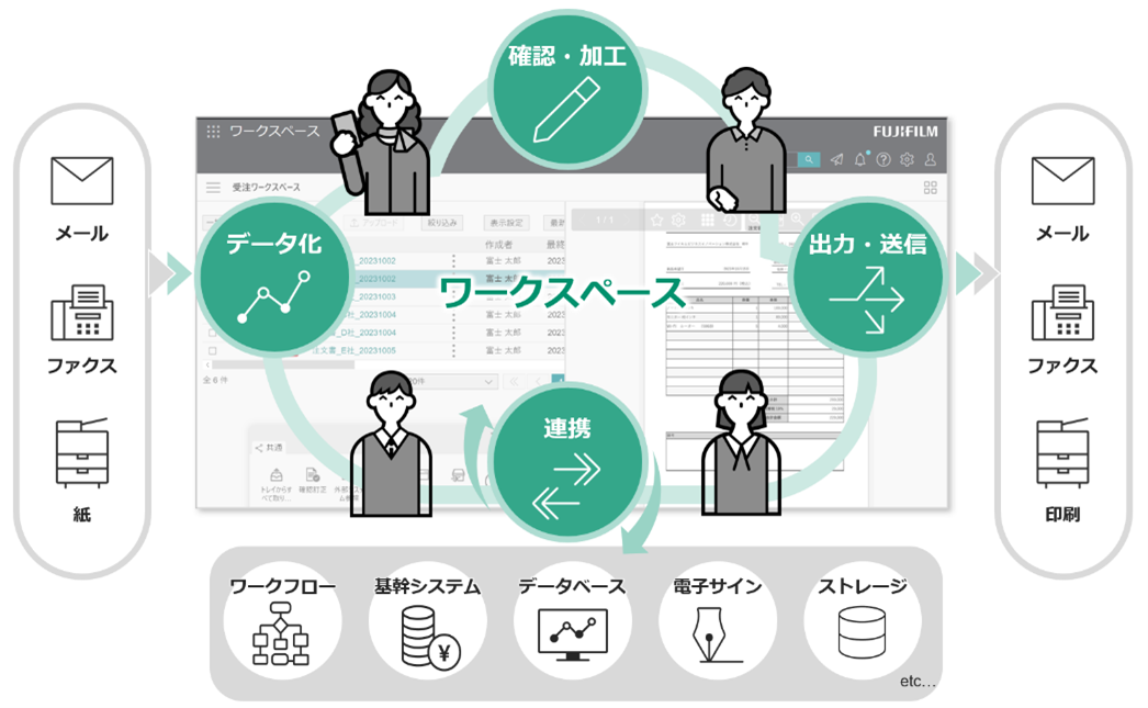 「FUJIFILM IWpro」は、中堅・中小企業を中心に幅広いお客様にご利用いただけるクラウドサービスです。クラウド上のワークスペースに紙やメール、ファクスなどで受け取る業務に必要な情報や、データ化・確認・加工・出力・送信など一連の業務を集約。ワークスペースを起点にさまざまな既存システムを繋ぎ、社内外のメンバーが共有することで協働を実現するものです。
