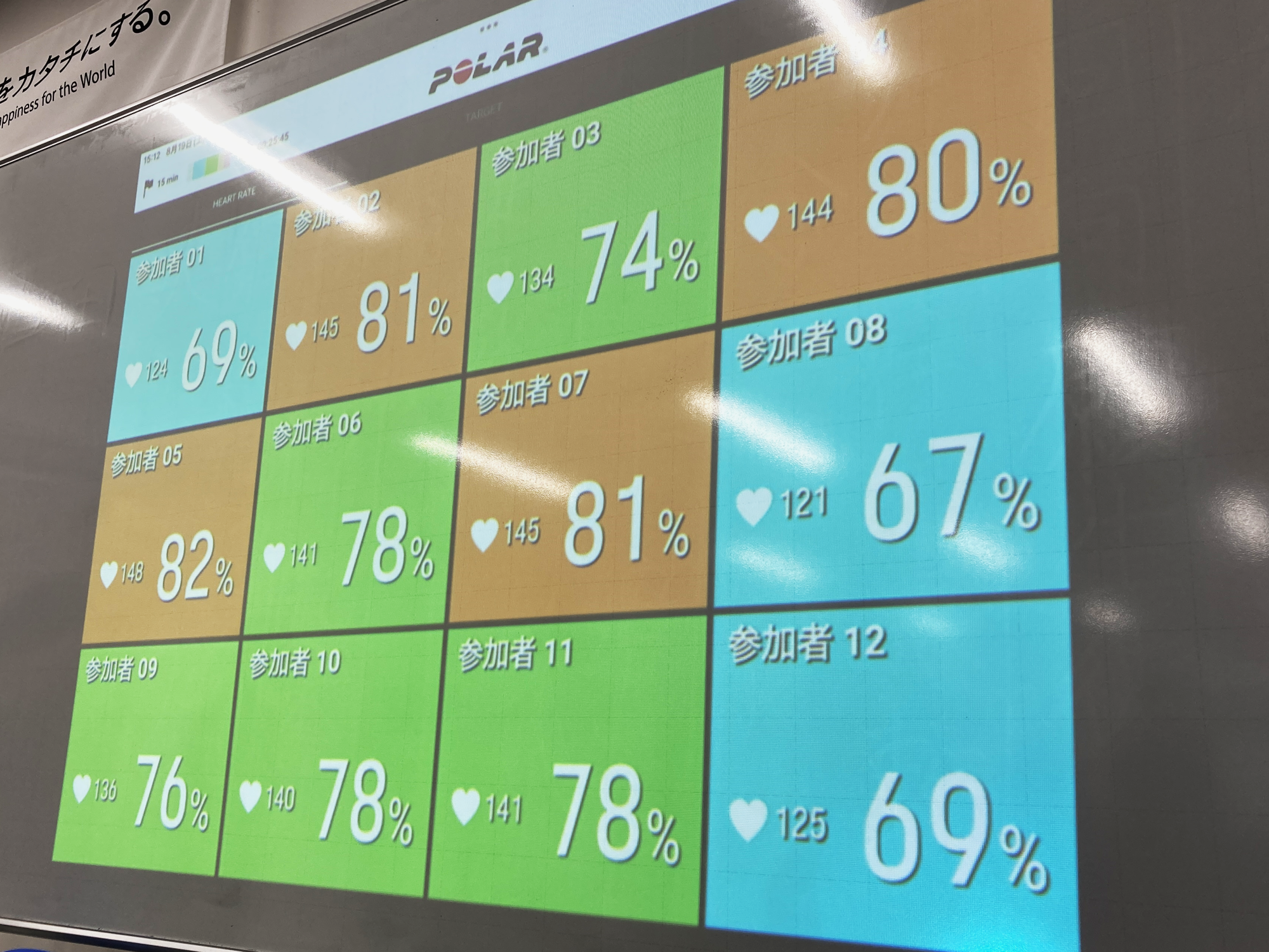 三鷹市立第五小学校の5年生に協力いただき、ポラールの心拍センサーPolar Verity SenseとPolar GoFitソリューションを用いて、リアルタイムの心拍数を確認しながら、持久走に取り組む体育授業を公開します。腕に装着した心拍センサーにより計測された心拍数を、体育館内の大きなスクリーンへリアルタイムで映し出します。児童は各自で心拍数を確認することで、適切な運動強度を保ちながら有酸素運動に取り組みます。