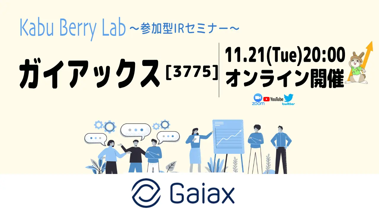 株式会社ガイアックス(本社:東京都千代田区、代表執行役社長:上田 祐司、証券コード:3775、以下 ガイアックス)は、Kabu Berryが主催する個人投資家向けオンラインセミナー「Kabu Berry Lab」に登壇いたします。
