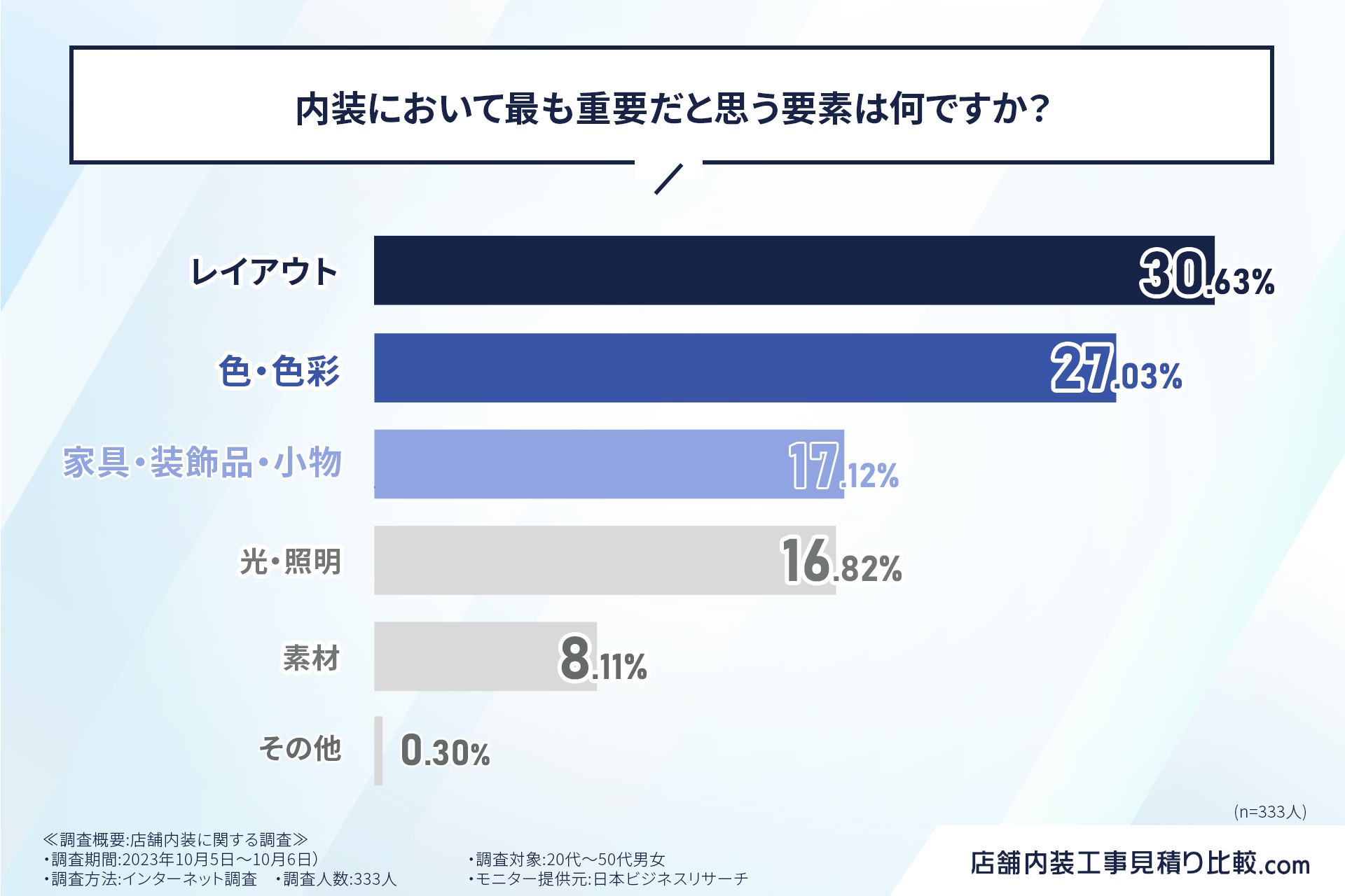 調査の結果、内装においてもっとも重要視されている要素は「レイアウト」であり、次いで「色・色彩」や「光・照明」が重要視されています。内装の配置やデザインが、店舗の雰囲気や使い勝手に大きな影響を与えていることがわかりました。