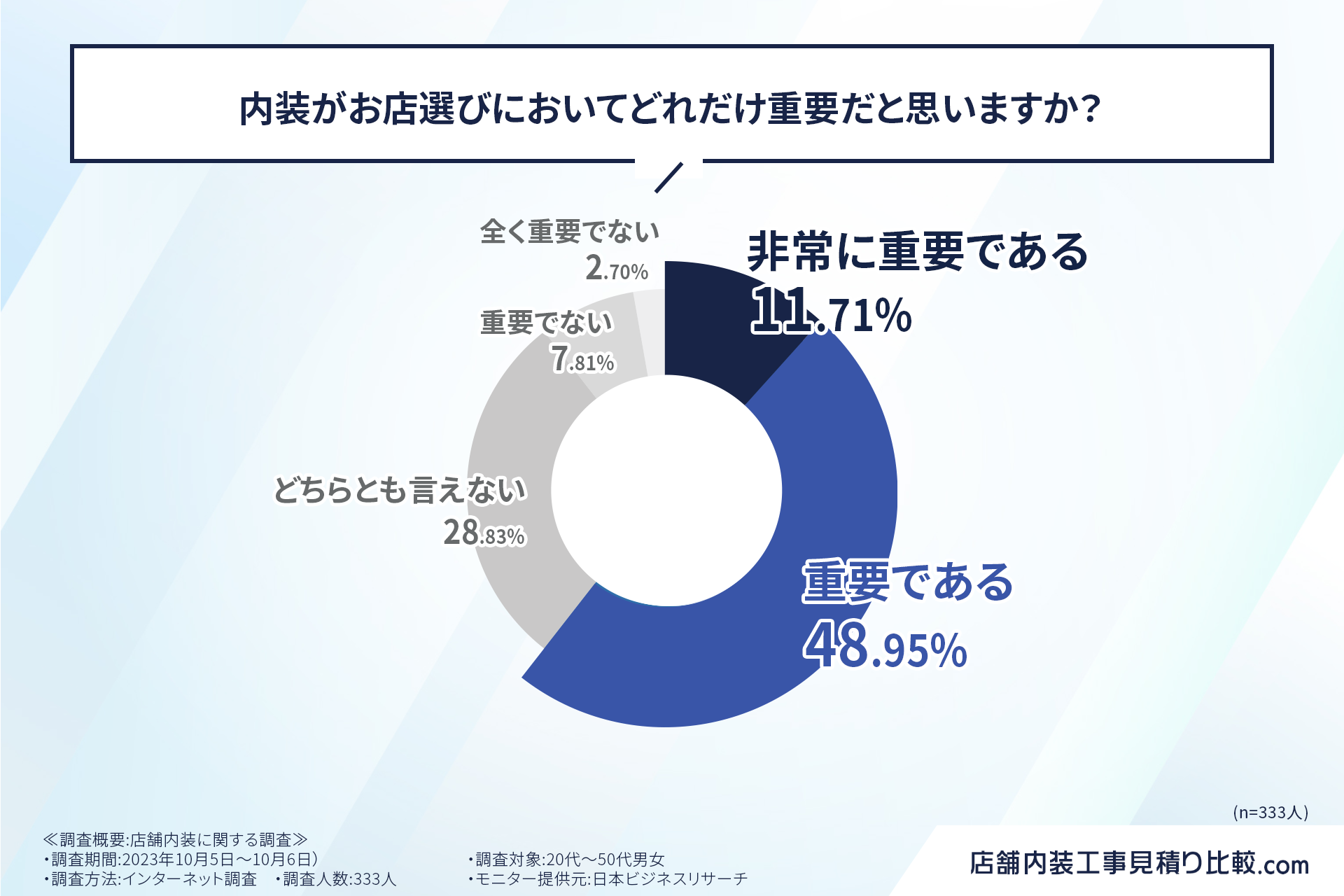 こちらの結果から、重要ではないと回答している方と比べ6倍以上の方が重要であると回答しています。また、過半数を超える方々が内装をお店選びにおいて重要視していることが分かります。