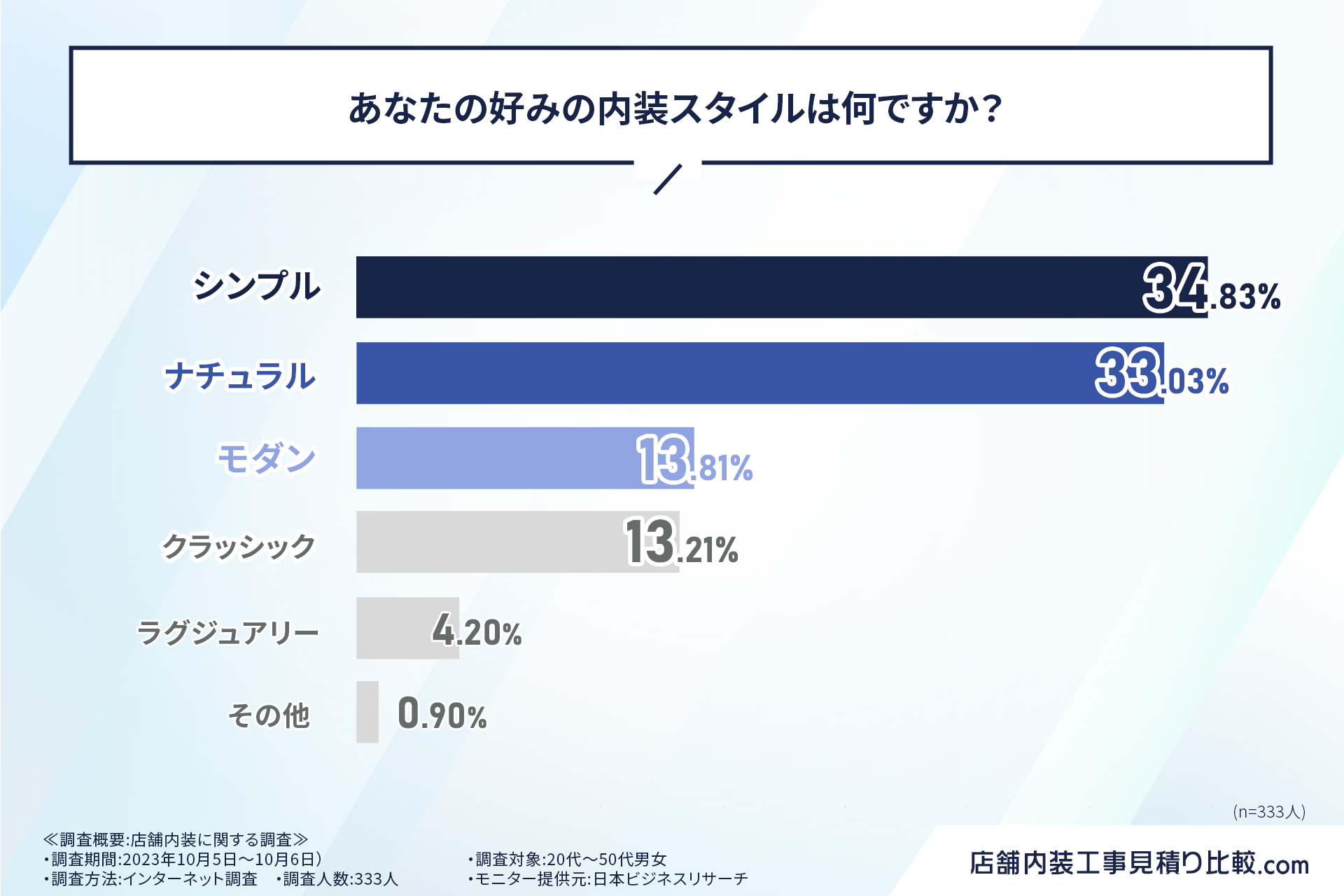 内装スタイルの選択肢が多様であるため、飲食店や小売店経営者は自身の店舗のコンセプトやターゲット顧客に合わせて内装を設計し、消費者の好みに対応することが求められていることがわかりました。