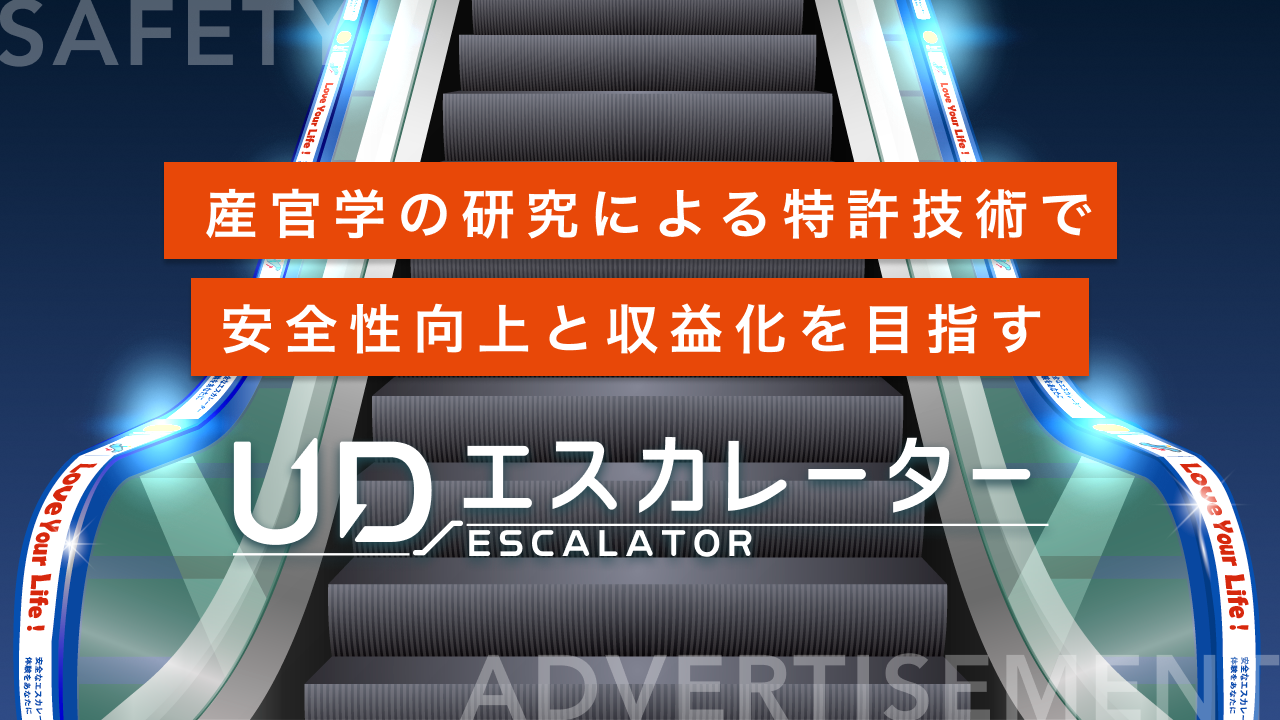 UDエスカレーターは、エスカレーターの手すりベルトにユニバーサルデザインが付された特殊シート「UDベルト」を施工することにより、安全性の向上と収益化の実現を目指すスタートアップです。