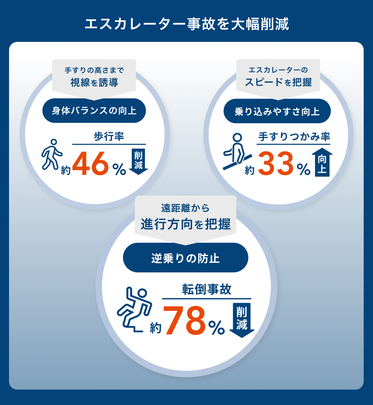 UDベルトは事故防止の効果が確認されており、UDベルトを導入したJR駅のエスカレーターでの追跡調査によると、転倒事故を6年間で平均約78%削減しました。(出所:一般社団法人日本鉄道車両機械技術協会「新・鉄道駅エスカレーターハンドブック」)