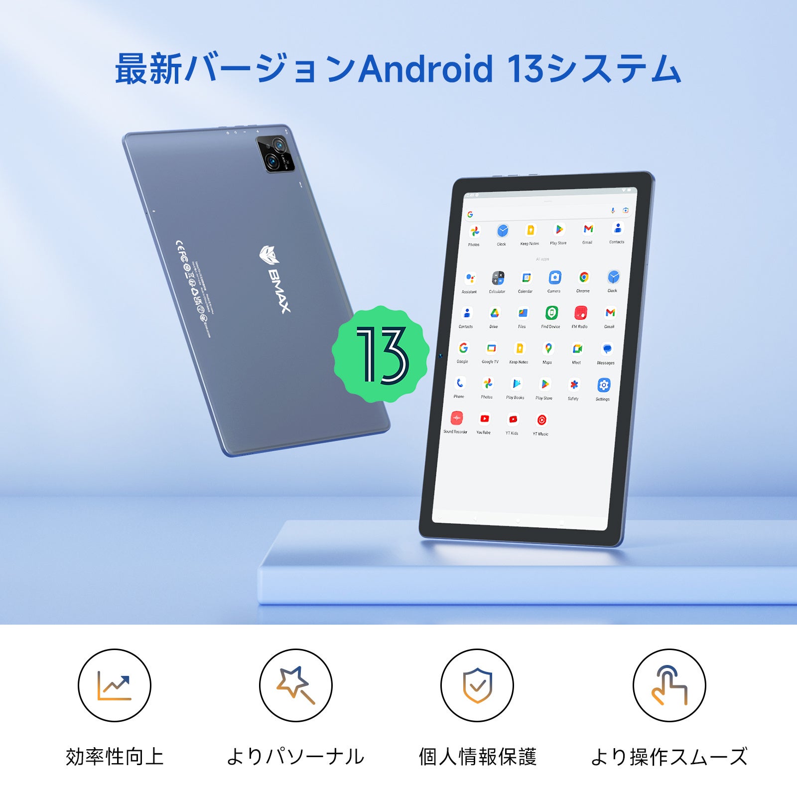 BMAX Android13 I11Plus タブレット最新なシステムAndroid13に更新しており、個人のプライバシー保護とセキュリティをアップグレードし、アプリに必要なストレージ容量のマウントを減らし、ランタイムデバイスの性能を向上させます。