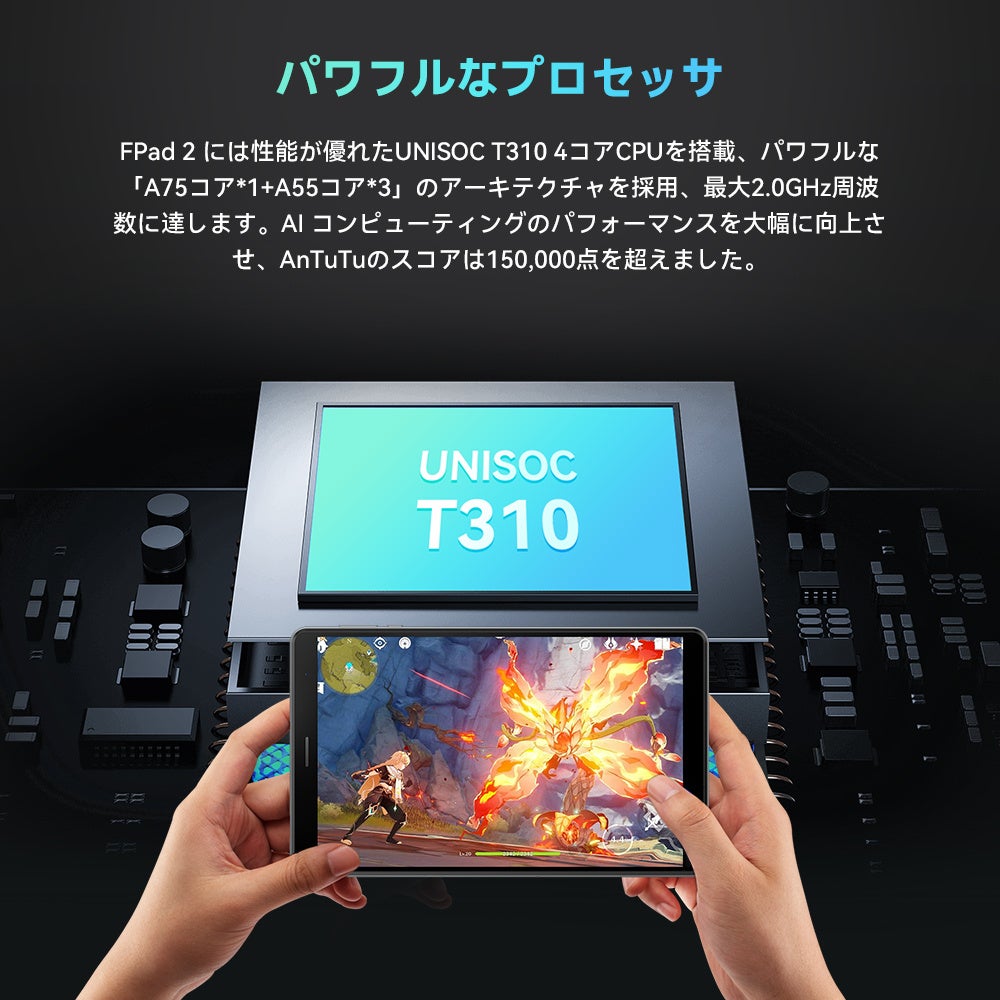 Fpad2 Proは、Unisocの高級シリーズCPU T310を搭載しており、A75の大型コアを統合しており、動作速度は最大2.0GHzに達し、ベンチマークテストでは153148ポイントを達成しています。オフィス作業やマルチタスクの処理をより簡単に行い、作業効率を効果的に向上させます。