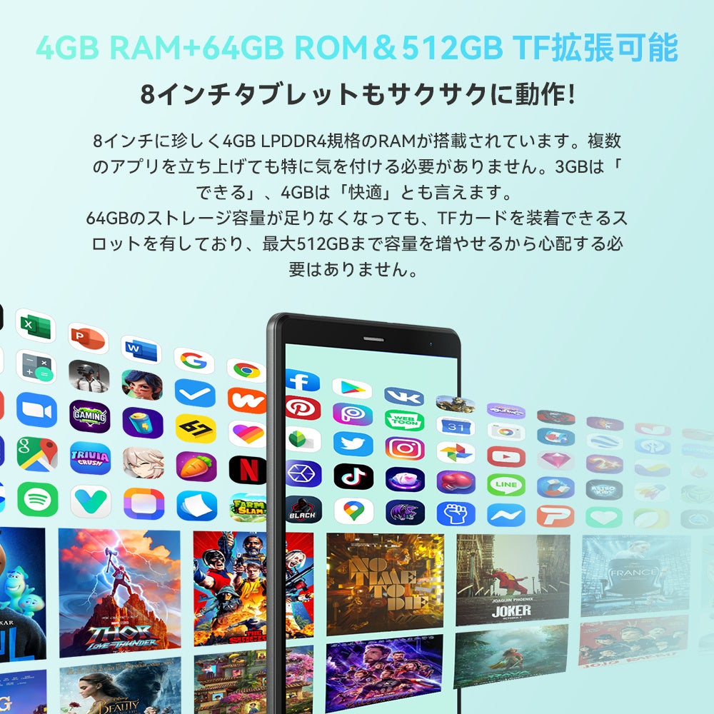8インチHD高解像度IPSディスプレイ、1280×800の解像度を備えています。