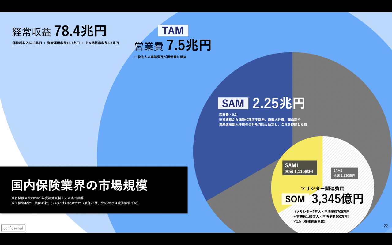 国内保険業界の経常収益は78.4兆円の巨大市場です。営業費7.5兆円をTAMと定義し、ソリシター関連費用3,345億円をSOMと定義しています。