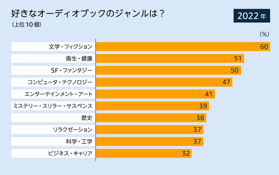 オーディオブックの人気のジャンルの変化も興味深いトピックです。文学・フィクションのジャンルは2022年から2023年にかけてトップの座を譲り、SF・ファンタジーが第1位に浮上、エンターテインメント・アートが第2位、ビジネス・キャリアが昨年の第10位から第3位に上昇しました。さらに、データによれば、31%のリスナーがオーディオコンテンツを会話の中で活用しており、オーディオコンテンツから得た知識や物語を友人や家族と共有し、会話の糧になっていることがわかります。調査に回答した人々の28%がオーディオコンテンツを活用して新しい知識を習得し続けています。オーディオコンテンツは、興味を持つトピックについて深く学びたいという欲求を満たし、知識の積み重ねに役立っています。