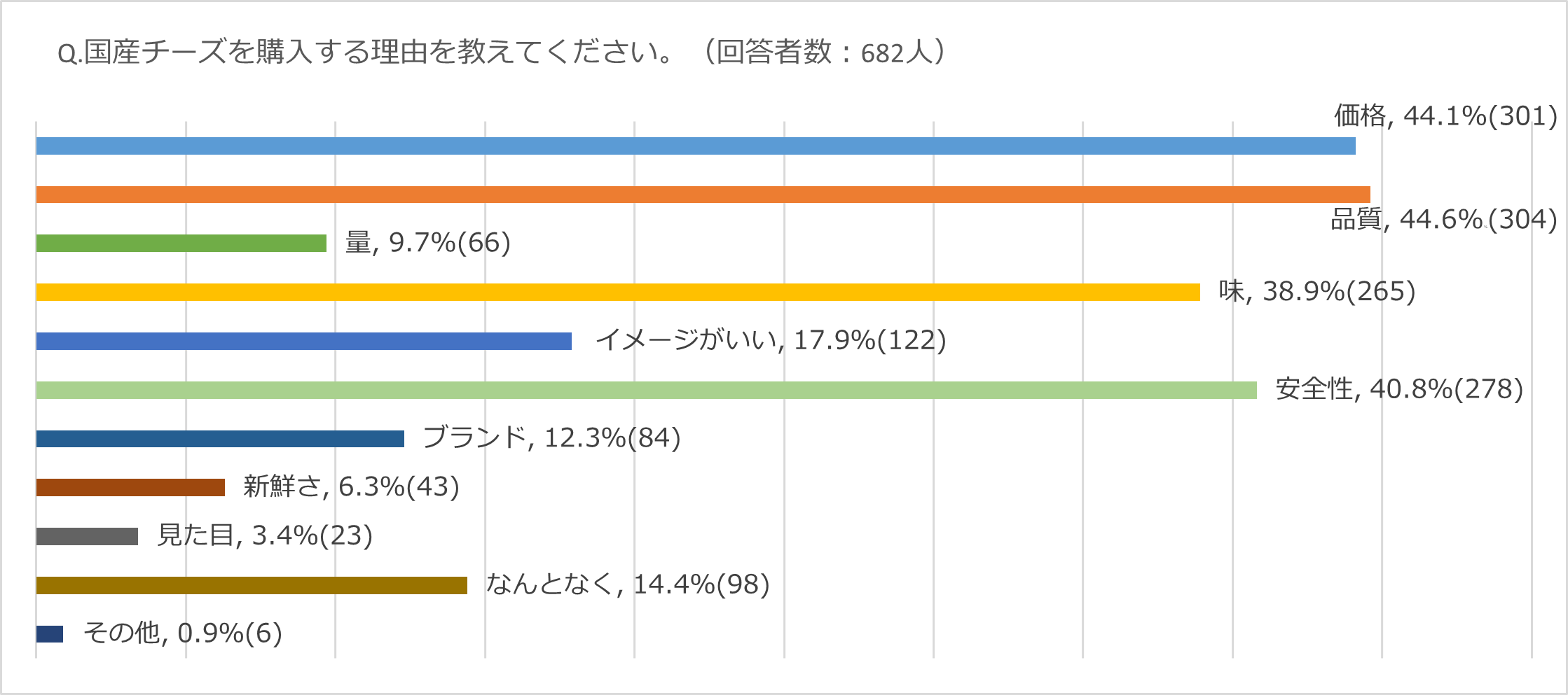 国産チーズを購入することが多いと回答した人に国産チーズを購入する理由を尋ねたところ、「品質」(44.6%)、「価格」(44.1%)、「安全性」(40.8%)、「味」(38.9%)が上位となりました。