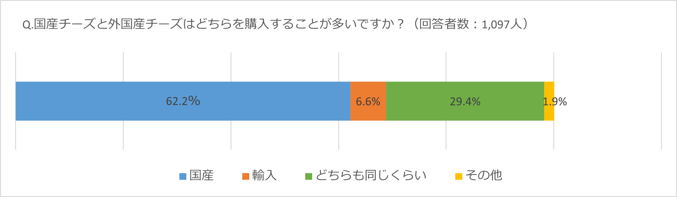 国産チーズと外国産チーズはどちらを購入することが多いか聞いたところ、「国産チーズ」と回答した人が62.2%と多数となり、「外国産チーズ」(6.6%)、「どちらも同じくらい」(29.4%)を上回る結果となりました。