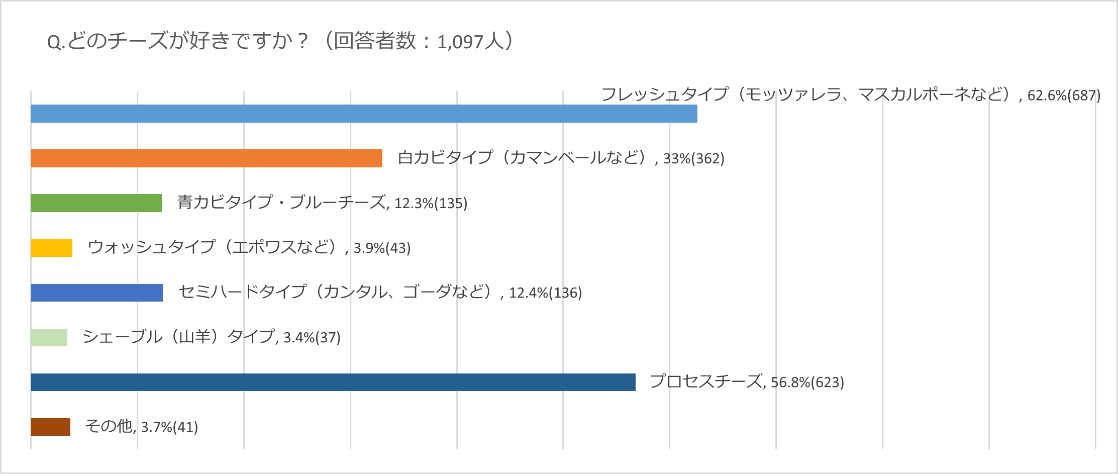 好きなチーズのタイプを尋ねたところ、「プロセスチーズ」(56.8%)、「フレッシュタイプ(モッツァレラ、マスカルポーネなど)」(62.6%)、「白カビタイプ」(33%)が上位となり、スーパーやコンビニなどで購入しやすいプロセスチーズが根強く人気が表れるとともに、ナチュラルチーズにおいては、癖が強くなくまろやかな味わいのフレッシュタイプや白カビタイプの人気が高くなる結果となりました。