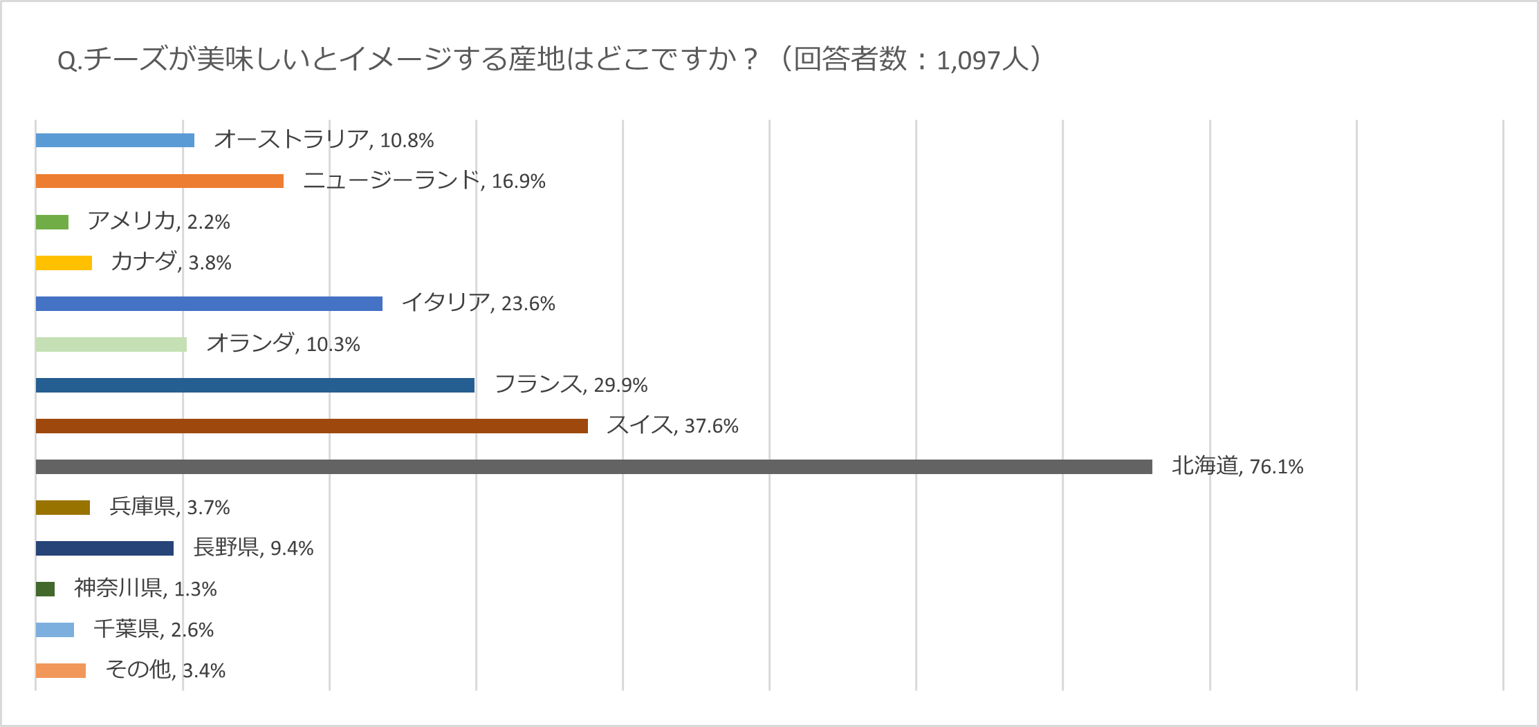 チーズが美味しいとイメージされる産地を聞いたところ、「北海道」(76.1%)が海外産を含む他の地域を大きく上回るトップとなり、「スイス」(37.6%)、「フランス」(29.9%)、「イタリア」(23.6%)、「ニュージーランド」(16.9%)、「オーストラリア」(10.8%)、「オランダ」(10.3%)と、外国産地が上位2位から6位までを占める結果となりました。国内の産地では、「長野県」(9.4%)が7位で、国内産地では北海道に次ぐ順位となり、国産チーズについては、北海道が外国産地を上回る圧倒的な認知を獲得している一方で、その他都道府県で生産されるチーズは認知が高くないことがわかる結果となりました。