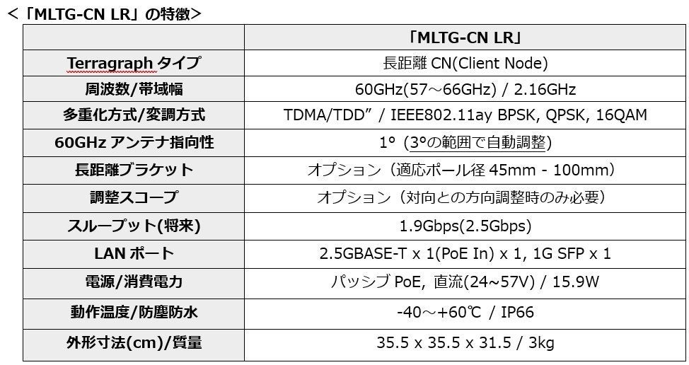 Terragraphに準拠した長距離クライアントノード。パラボラアンテナを搭載することで、長距離通信を可能にしたモデル。MLTG-360(分散ノード)との通信距離は700m。「MLTG-CN LR」対向で1kmの通信が可能です。