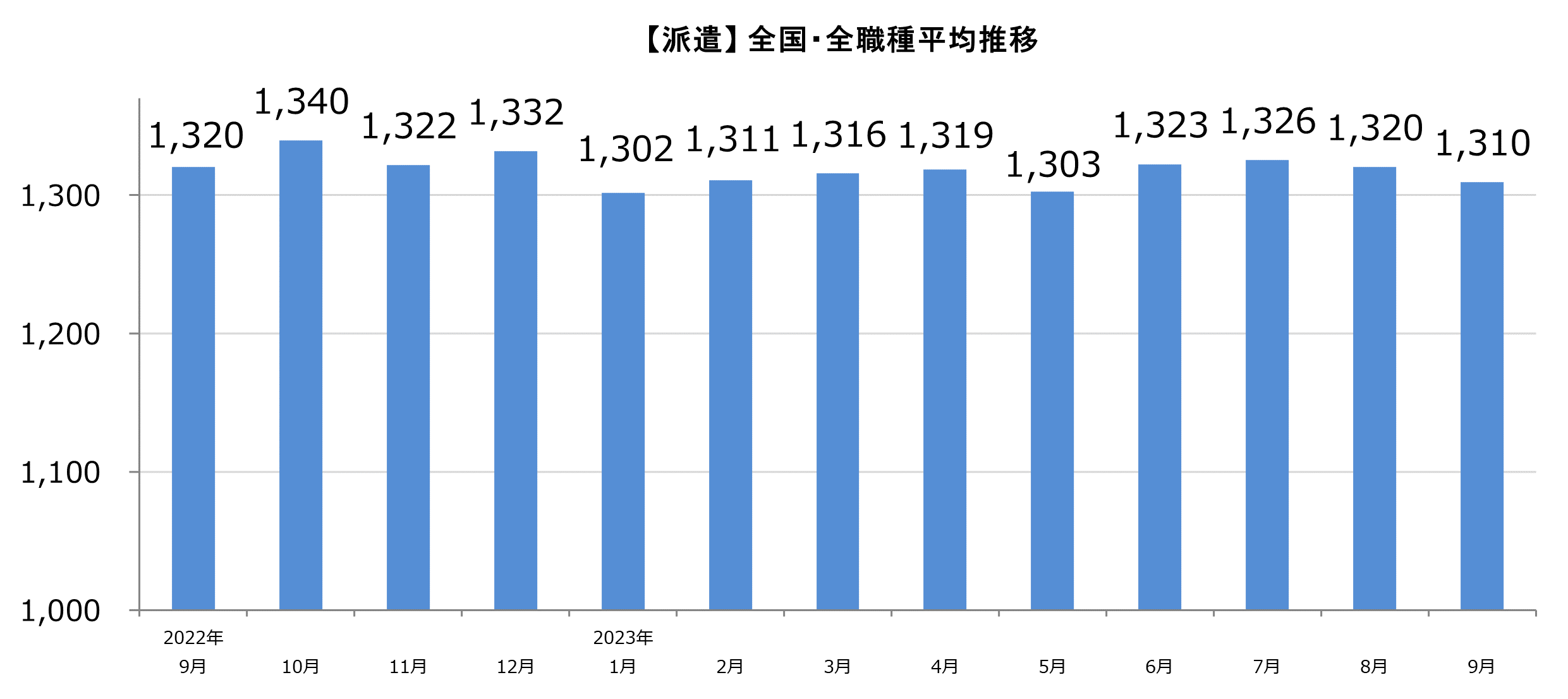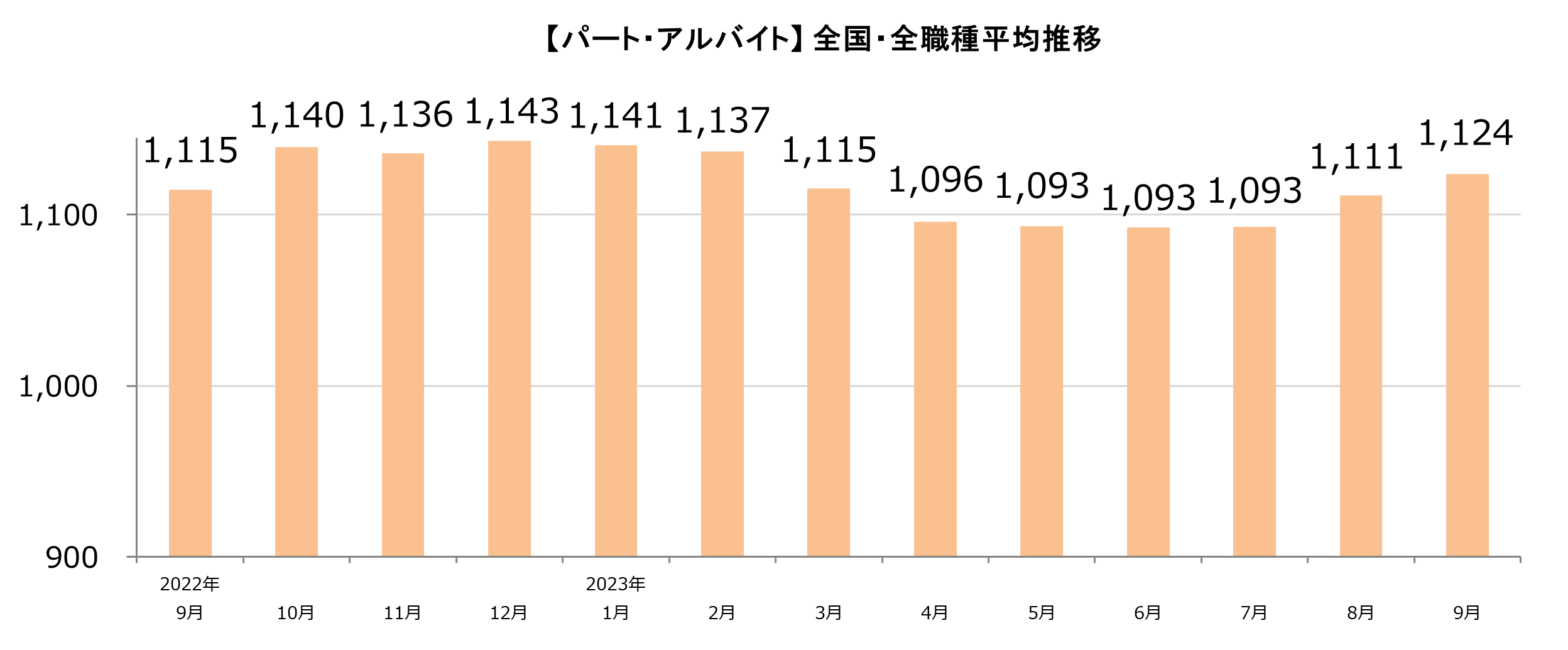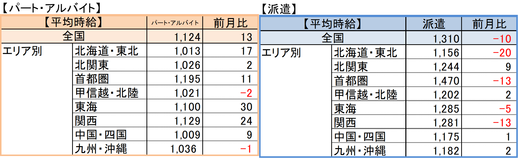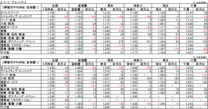 【パート・アルバイト】全国・全職種平均時給は1,124円。前月比+13円。前年同月比+9円。 【派遣】全国・全職種平均時給は1,310円。前月比-10円。前年同月比±0円。 【傾向】 パート・アルバイトの平均時給は2ヶ月連続で上昇した。10月からの最低賃金改訂に向けた、時給の引き上げが影響したとみられ、8エリア中6エリア、12職種中8職種で前月比プラスとなった。また、一部の企業では、採用競争の激化や長引く物価高の影響を受けて、応募を集めるために時給を引き上げる動きも見られた。 パート・アルバイト/派遣それぞれ平均時給の動向は異なるが、双方でしゅふ層の人材ニーズが高まっている傾向があるものと考えられる。 |