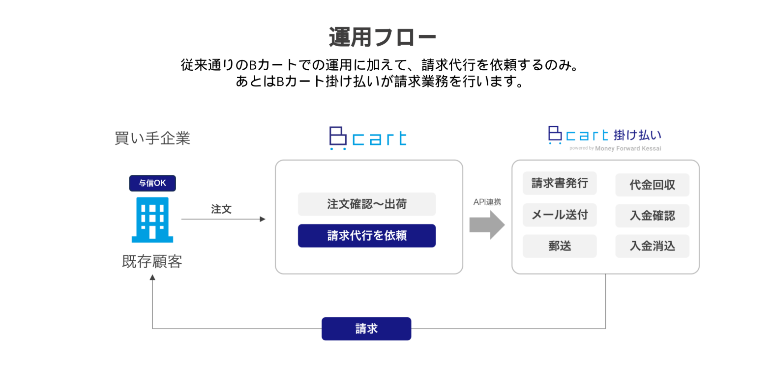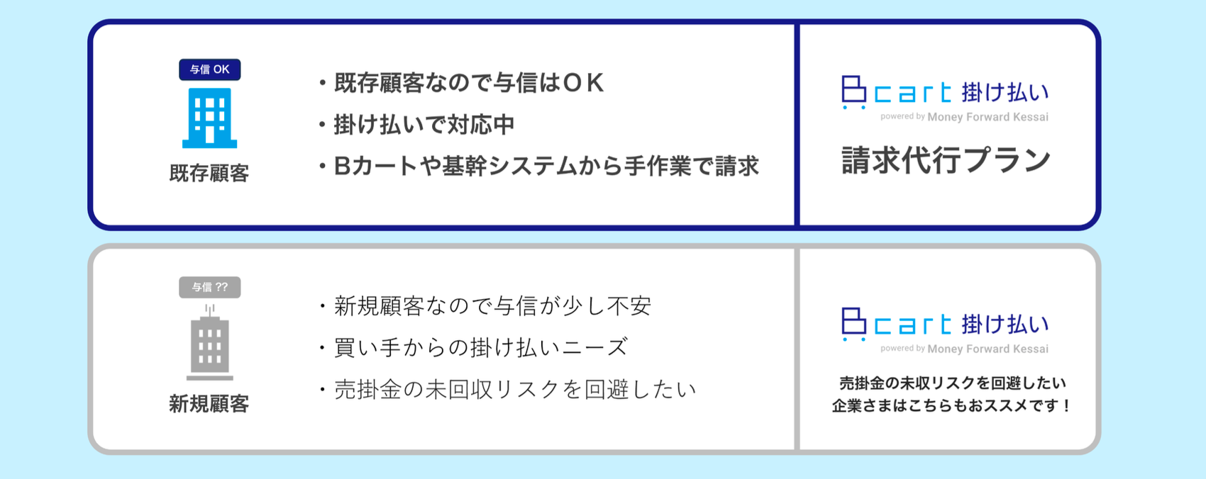 そしてこのたび、『Bカート掛け払い powered by Money Forward Kessai』に「請求代行プラン」を追加しました。これにより、「自社掛け」を行う企業でも請求業務のみをより安価にアウトソースし、自動化することができるようになりました。