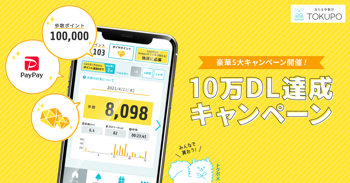 「当たる歩数計アプリ TOKUPO」10万DL達成キャンペーン