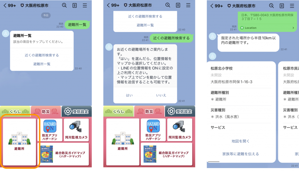 今回のリニューアルでは「避難所検索機能」を導入しています。自分の位置をLINEに送信すると、近くの避難所施設を案内することができる機能です。普段から近くの避難所を確認しておくことが可能になっており、災害が発生した際は開設状況なども知ることが可能です。