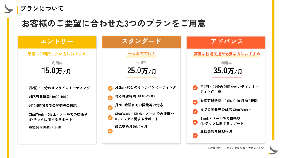 その中で、企業様の抱える課題を知る機会が多くあり、当社のもつノウハウでそれらの課題を解決すべく「定額制技術顧問」サービスを提供するに至りました。