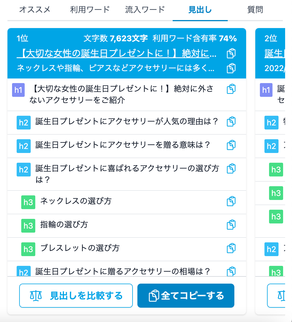 [見出し]タブでは、Googleで上位表示されているサイトごとに、利用ワード含有率を確認することができます。