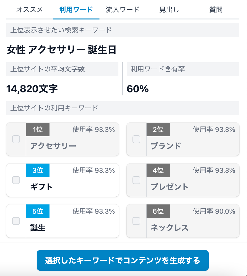 上記のご意見をうけて、Googleで上位表示されているサイトと、自社の記事の文章中のキーワード含有率を確認できる機能をリリースいたしました。当機能により、上位サイトと比較しながら文章中に適切にキーワードを含めることが可能になり、記事のSEO効果を高めることができるようになりました。