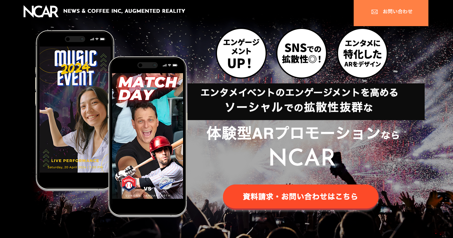 NCARは、エンタメに特化した体験型ARプロモーションサービスです。最新のテクノロジーを駆使し、音楽、アート、スポーツ、ゲーム、映画、PRイベントなど、幅広いエンタメ分野に特化したARコンテンツを企画し、新たな楽しみや驚きをお届けいたします。また、Web AR、Instagram、TikTokなどのプラットフォームでARを展開いたします。