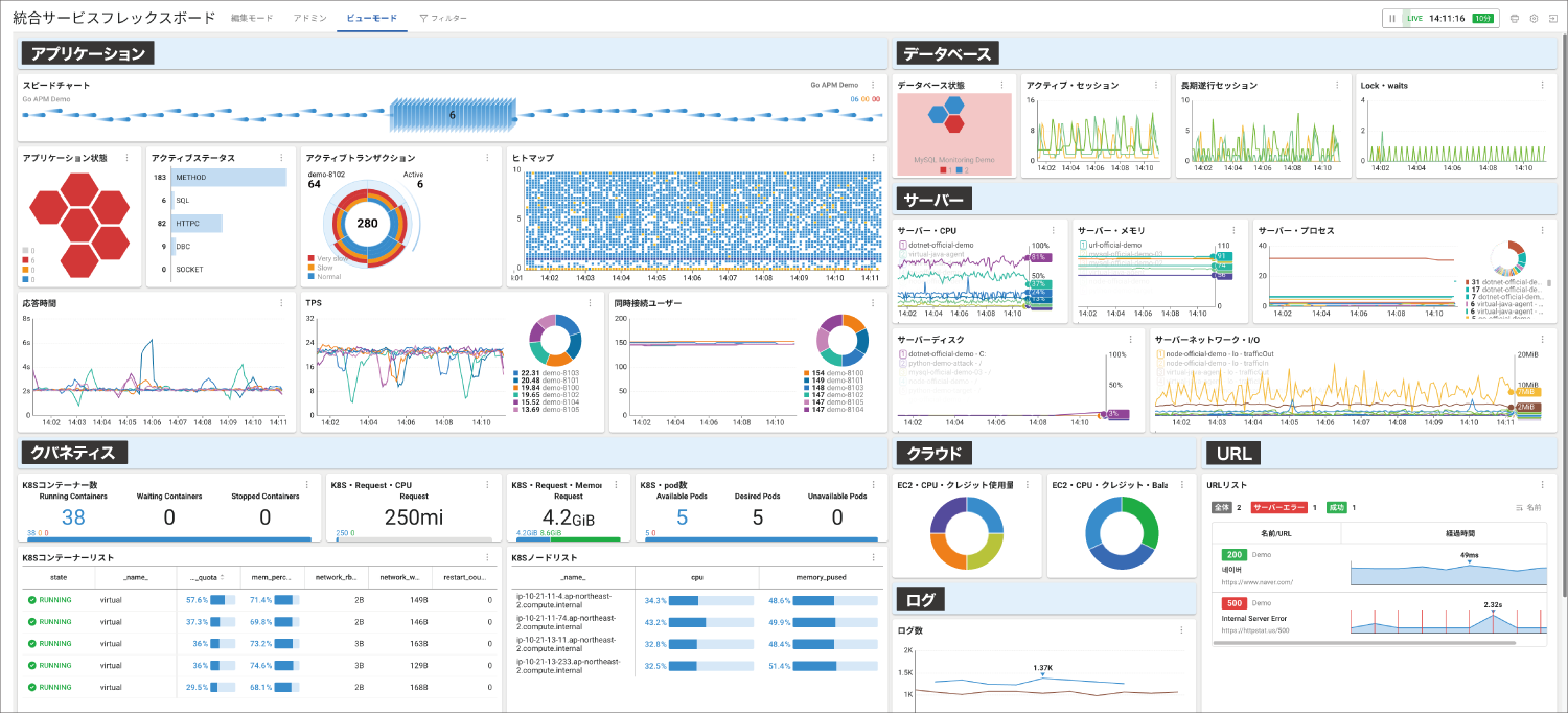 アプリケーションやデータベース、クバネティスなどの稼働状況を1画面で確認できる、統合サービスフレックスボード。表示する項目はユーザー独自にカスタマイズできます。